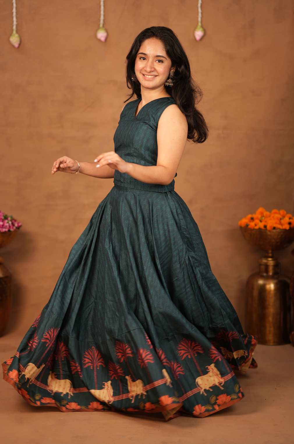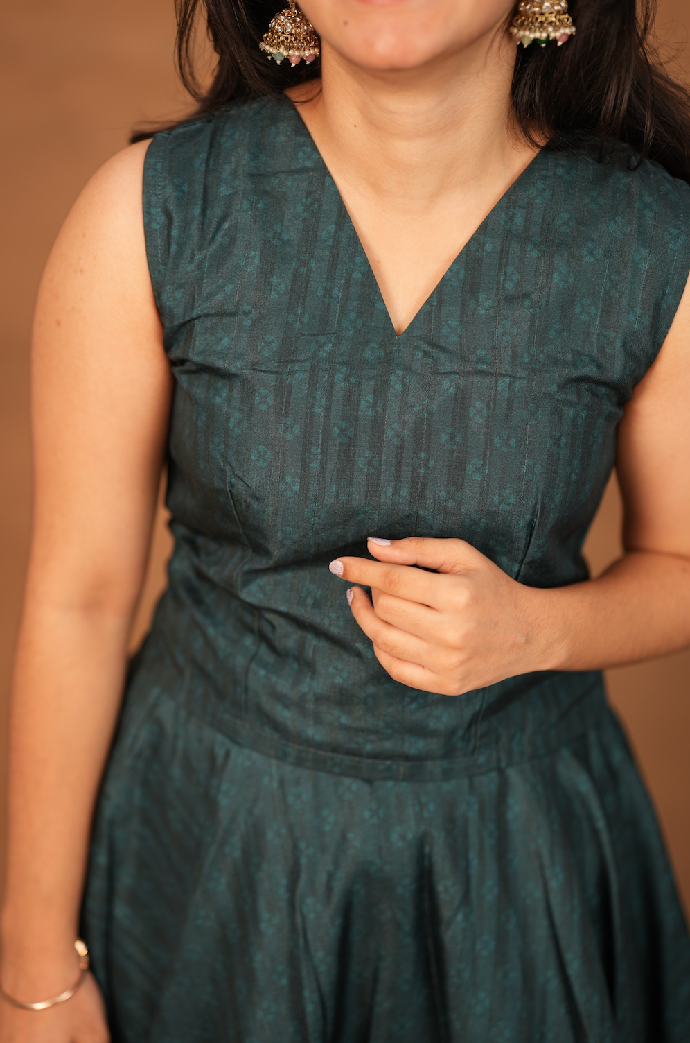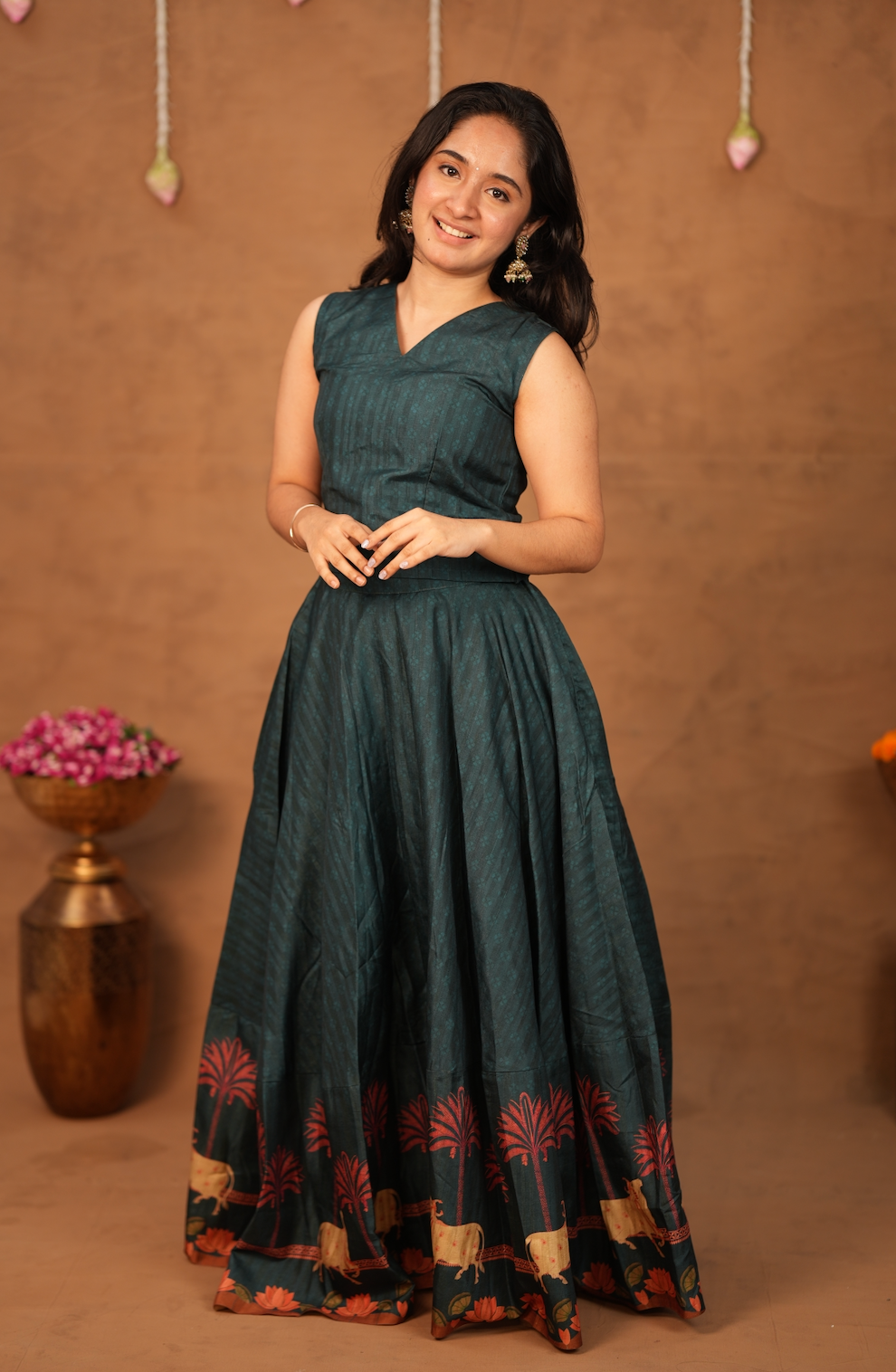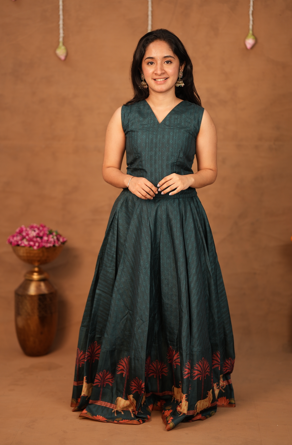 Semi tussar silk featuring a sleeveless(can be customised with sleeves) and V neck top with a flowing full circle skirt.