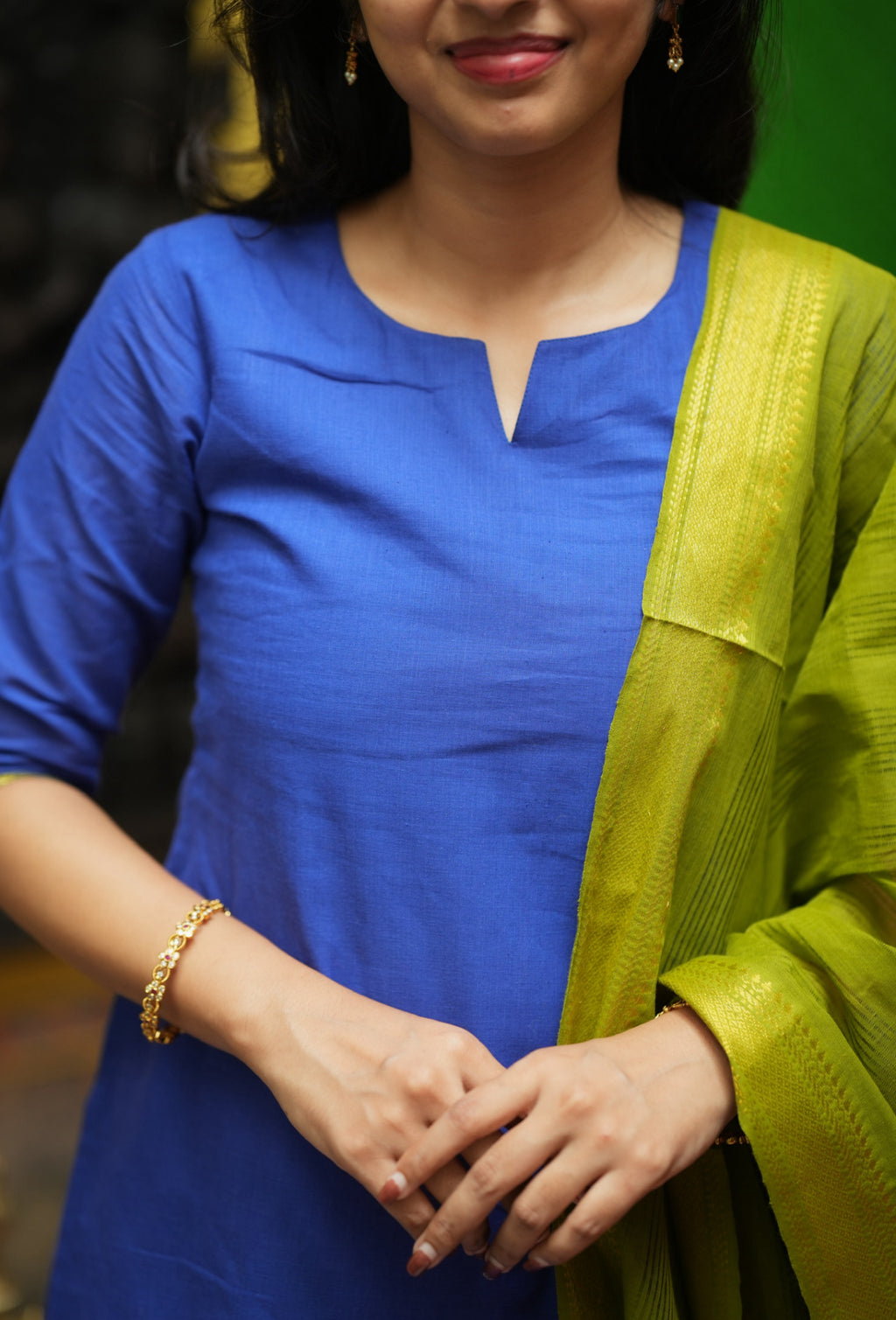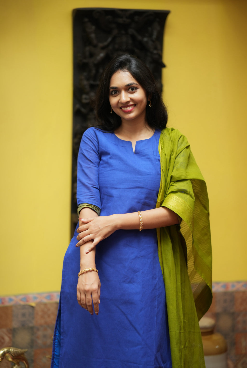 Paired with a solid bottom and full size woven tassel dupatta