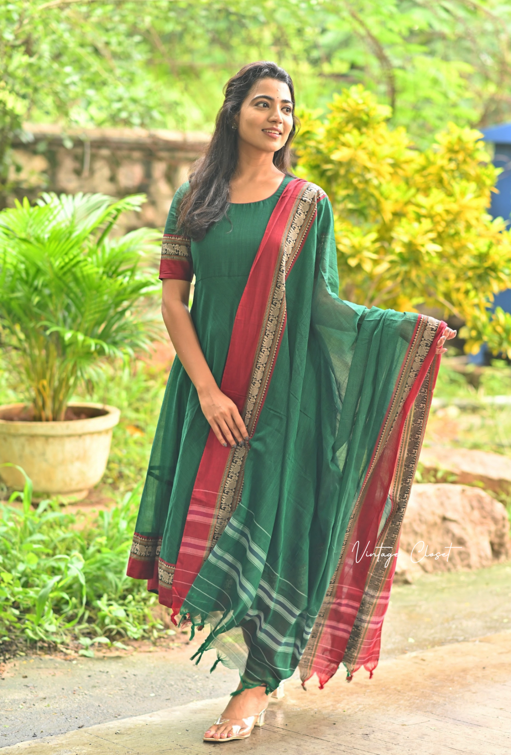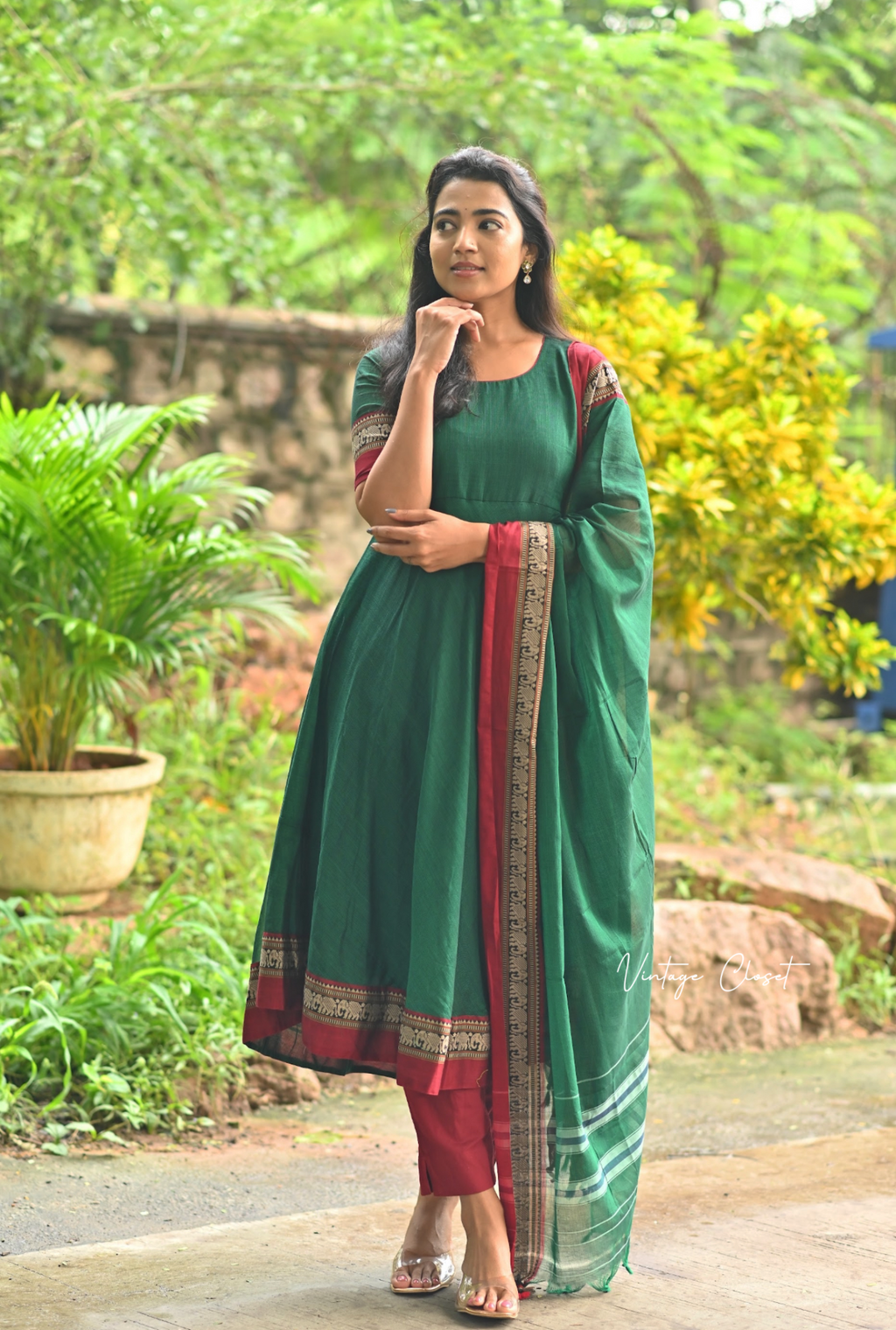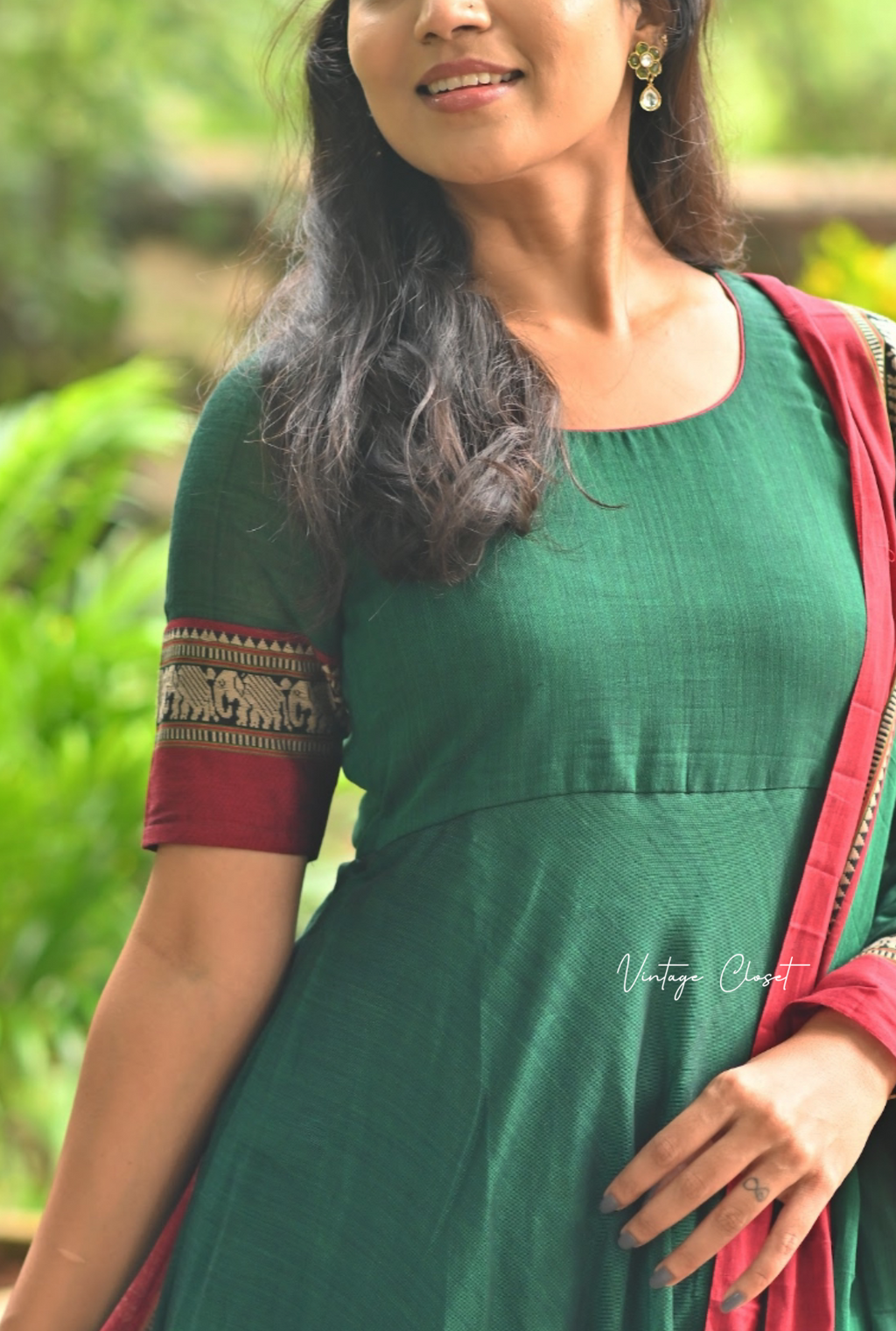 Elephant design woven reference handloom Anarkali kurti with a striking temple big border and attached cotton lining