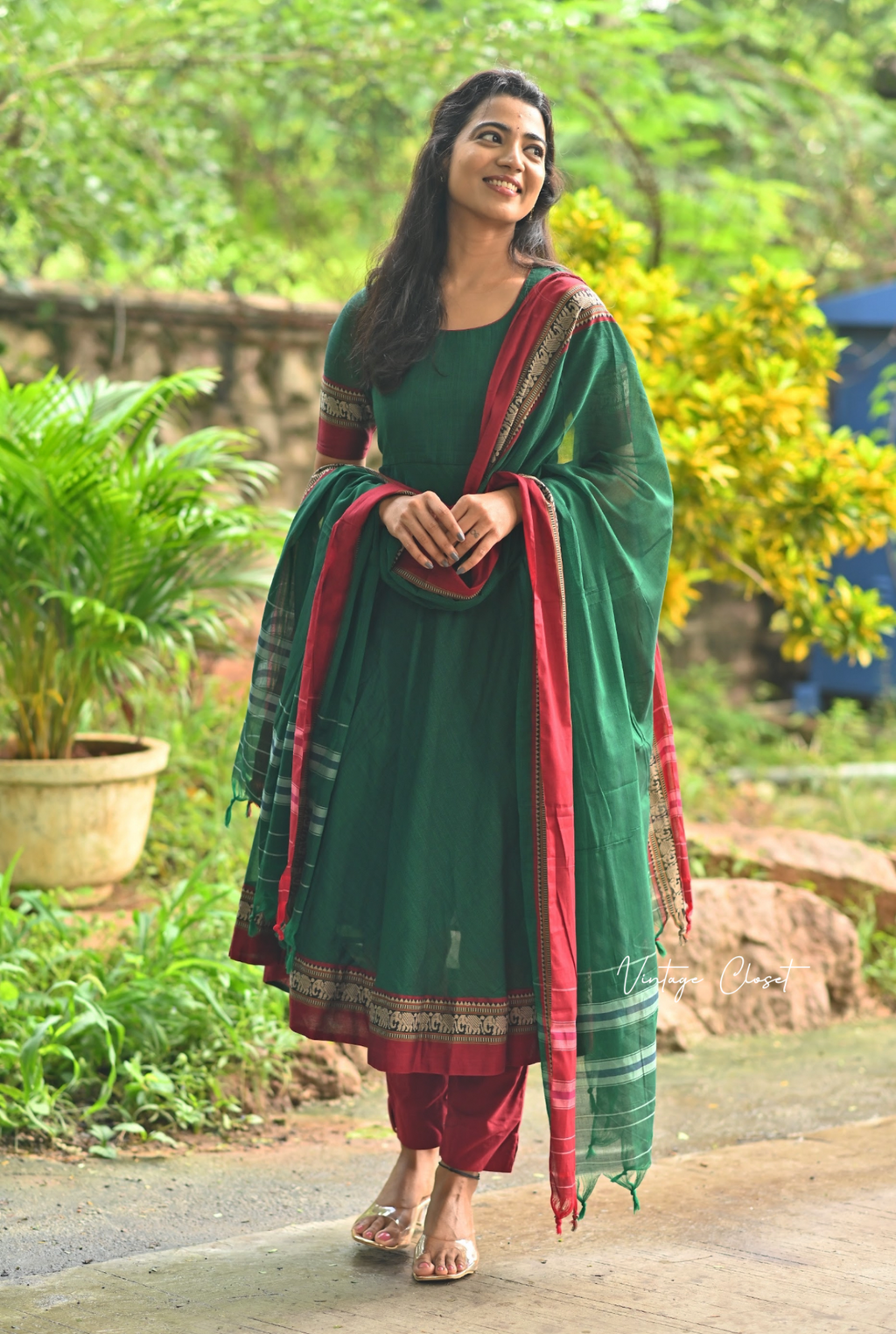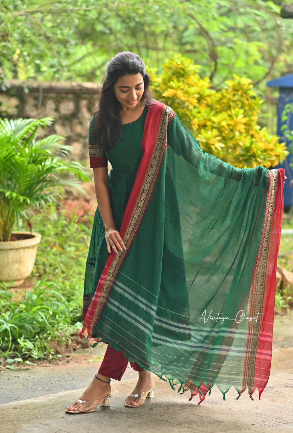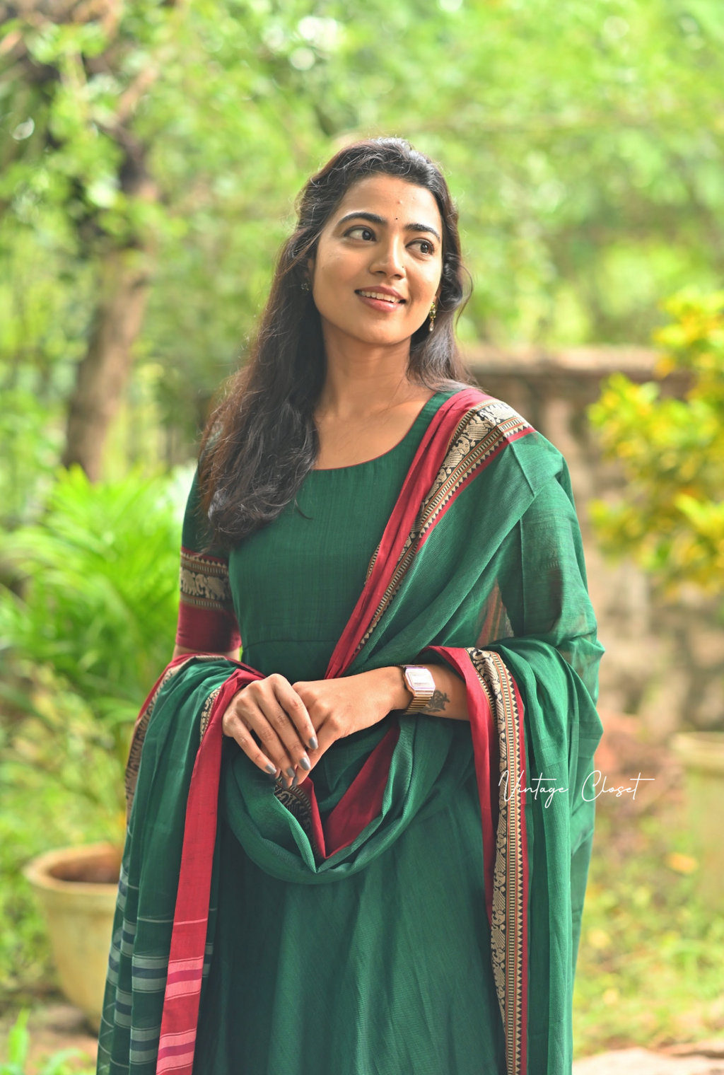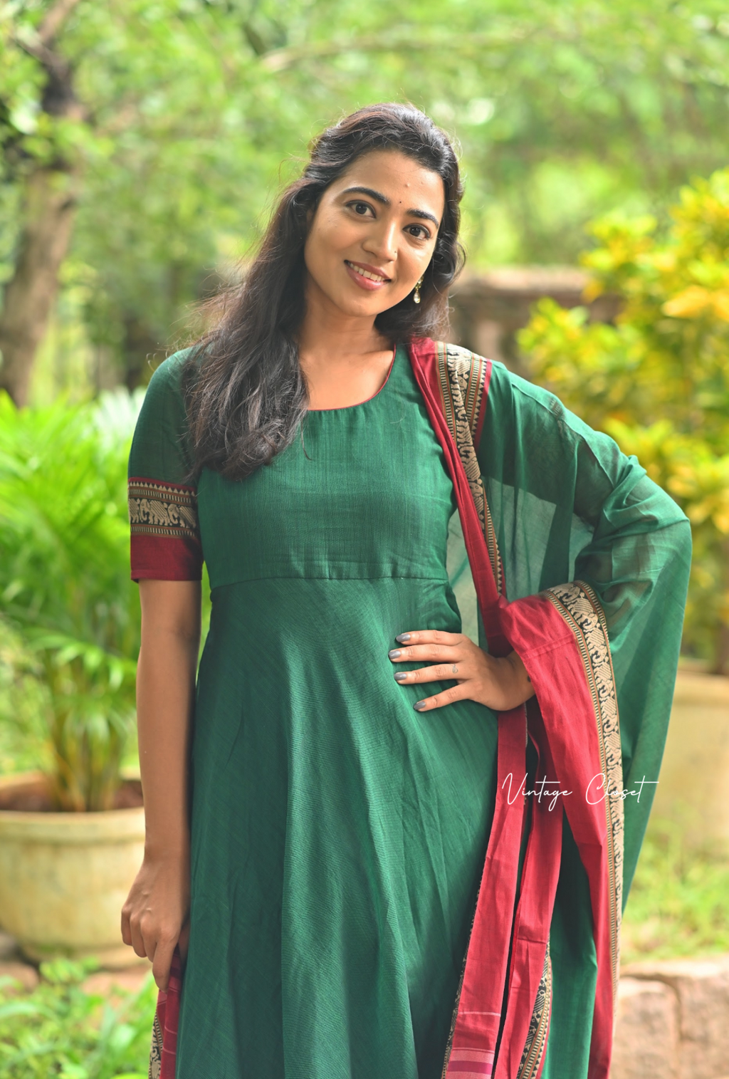 Elephant design woven reference handloom Anarkali kurti with a striking temple big border and attached cotton lining