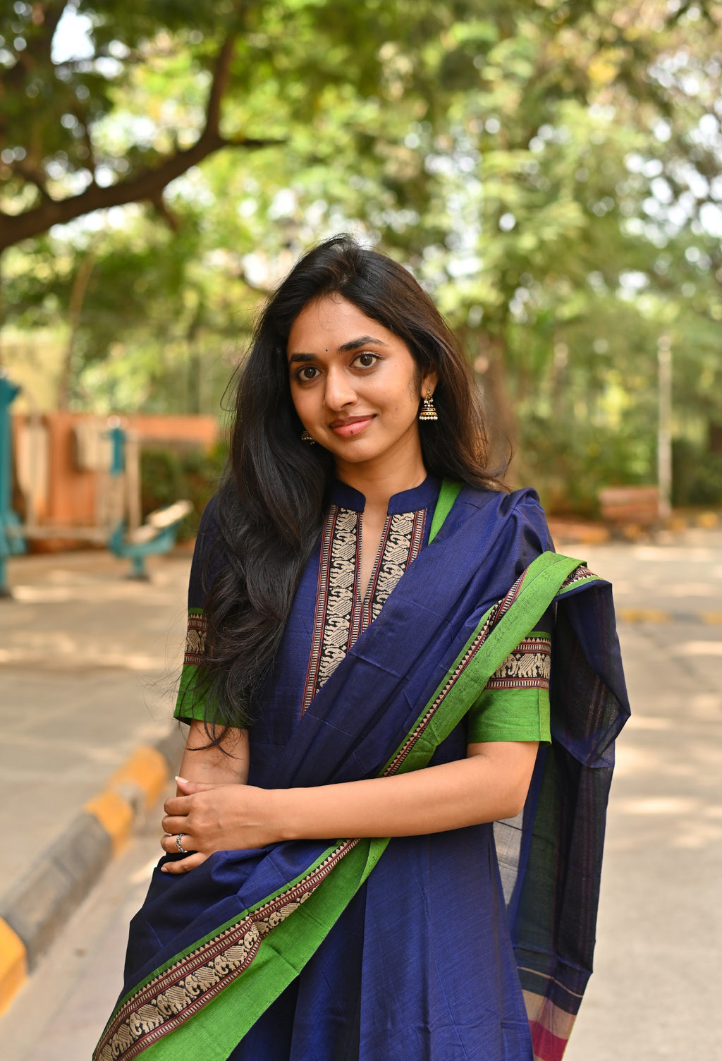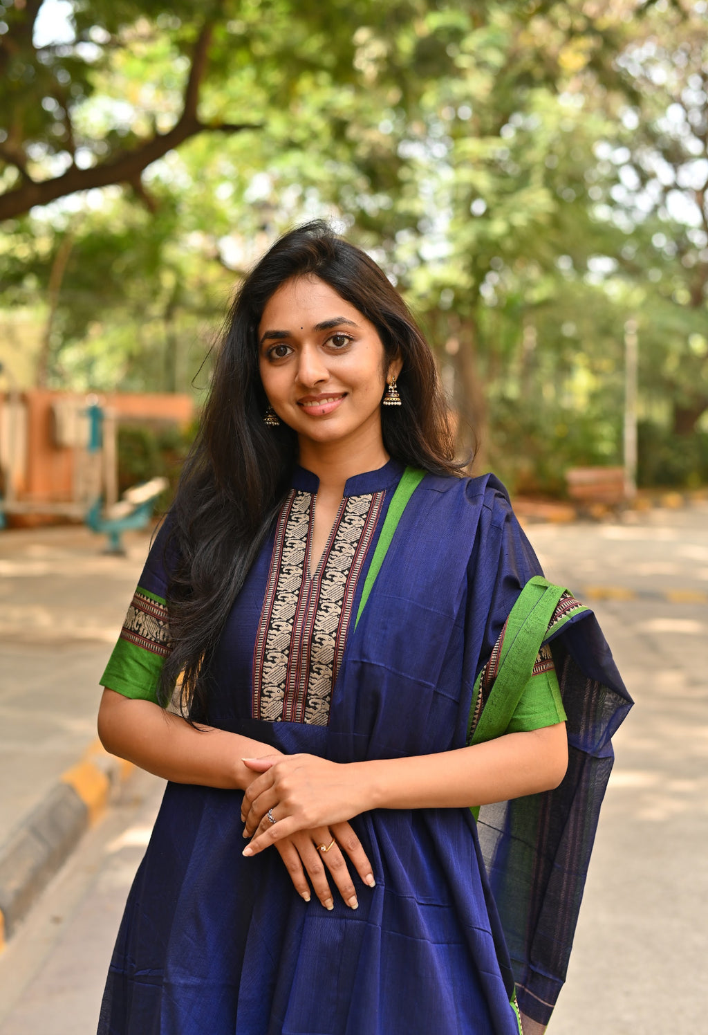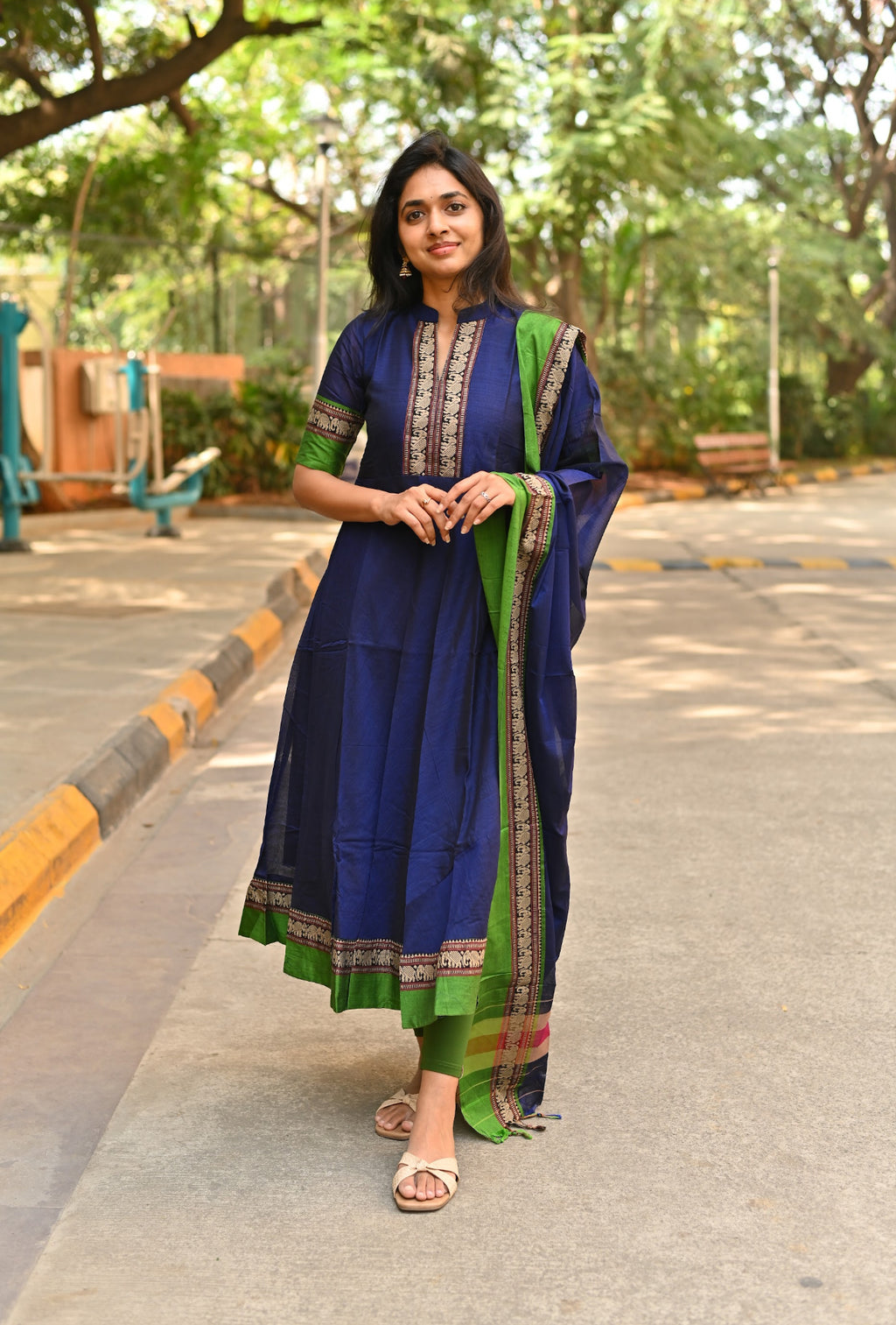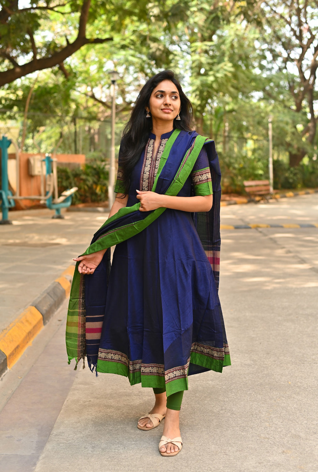 Elephant design woven reference handloom Anarkali kurti with a striking temple big border and attached cotton liningĀ