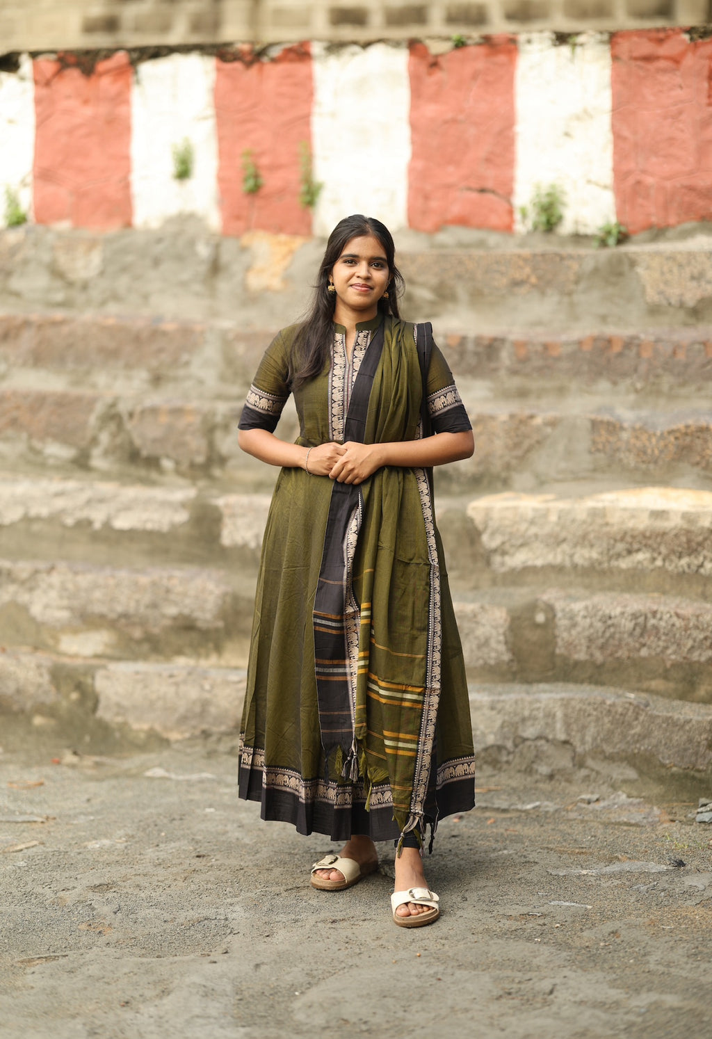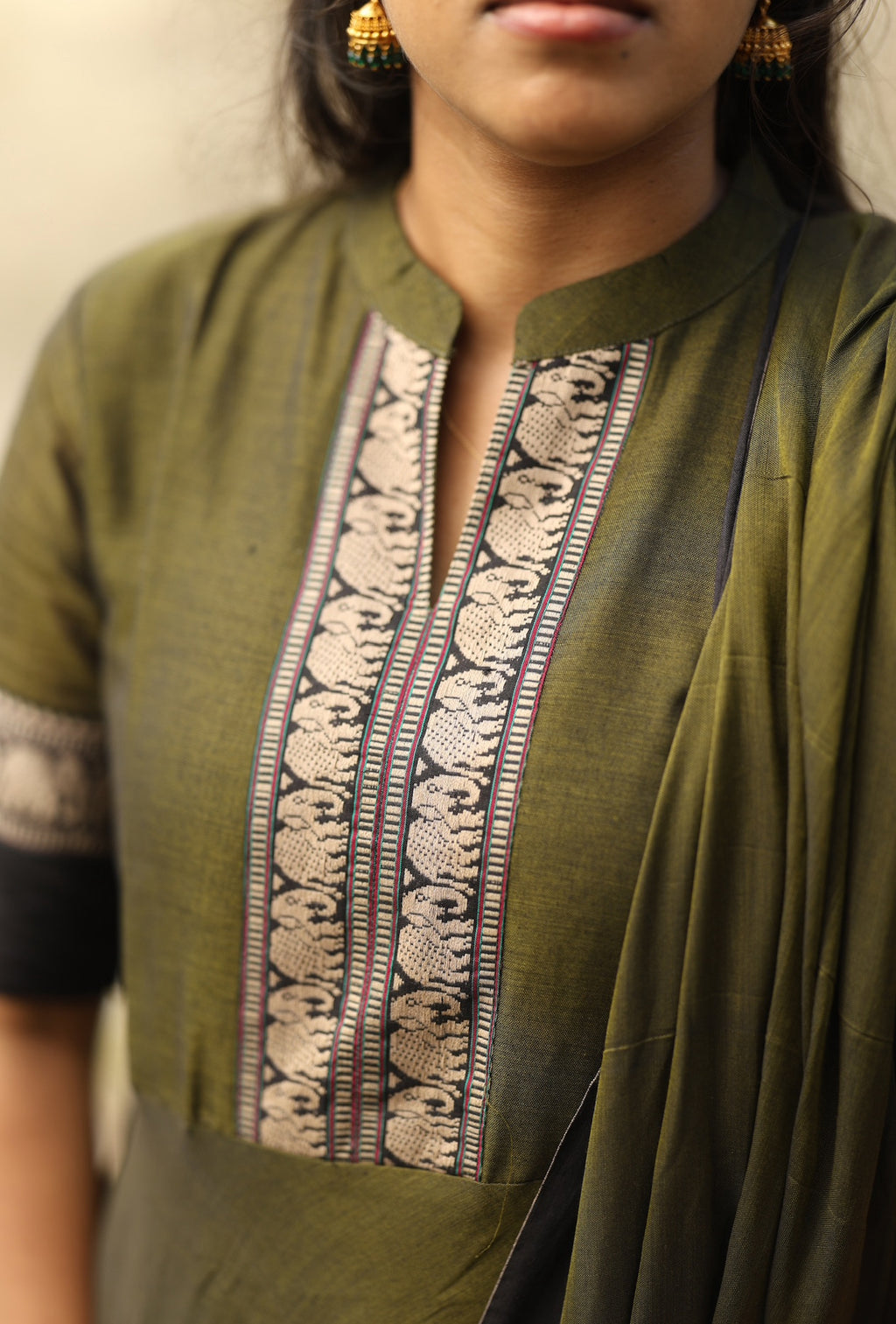 Elephant design woven reference handloom Anarkali kurti with a striking temple big border and attached cotton lining