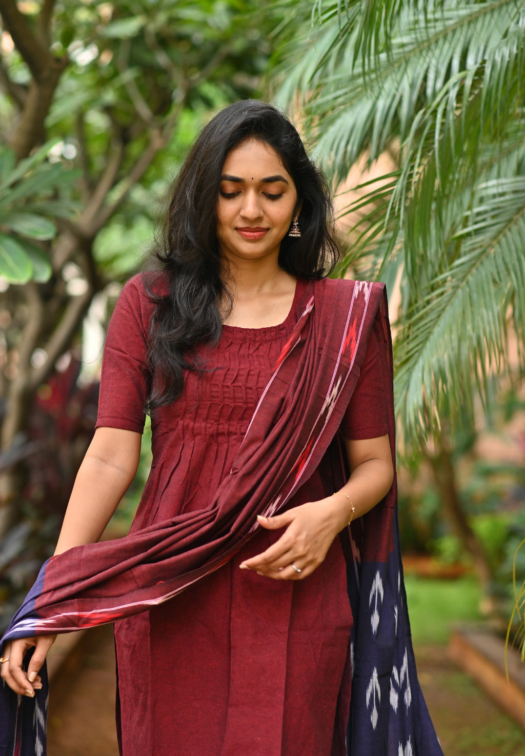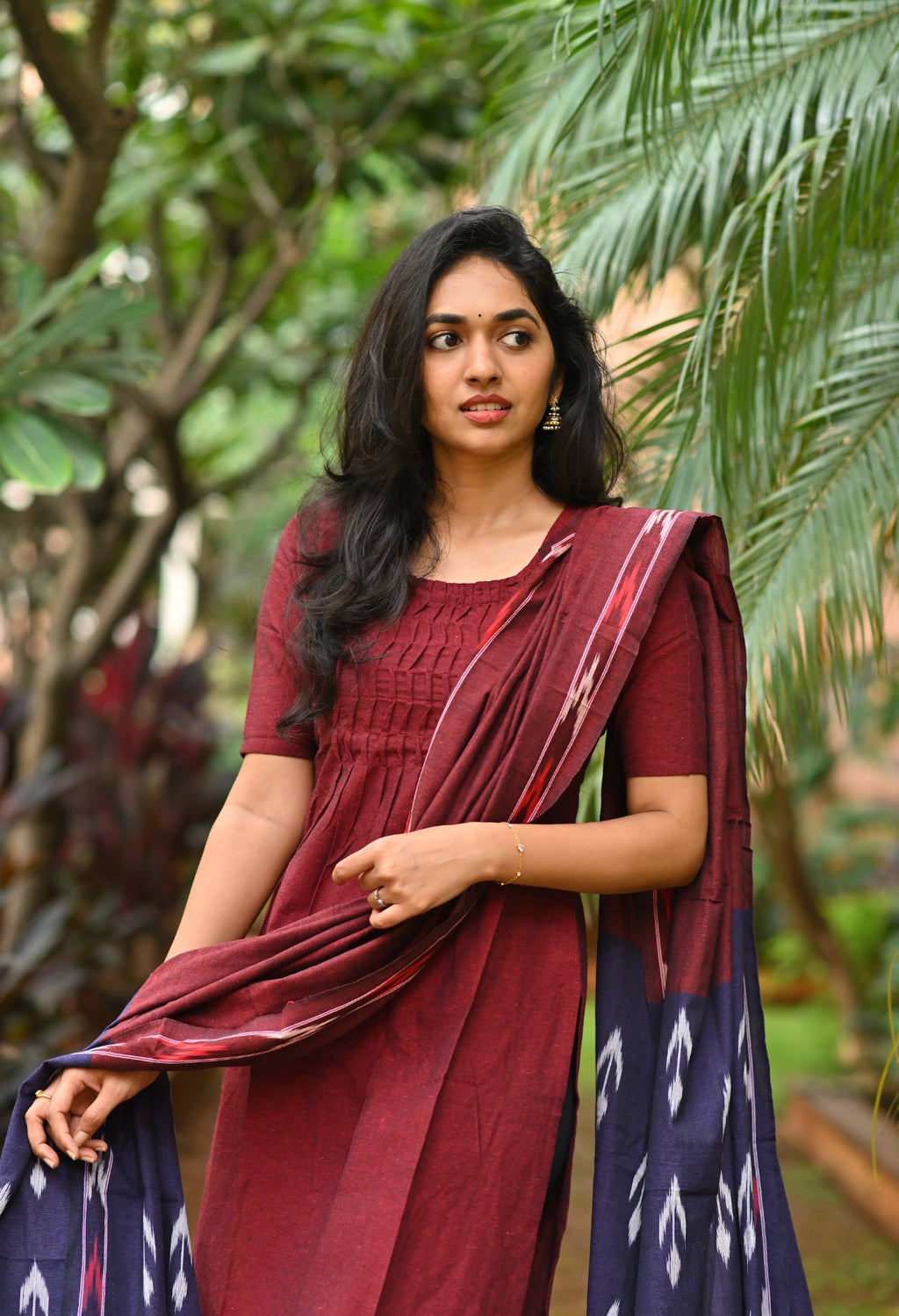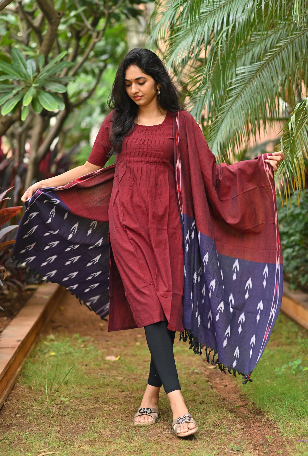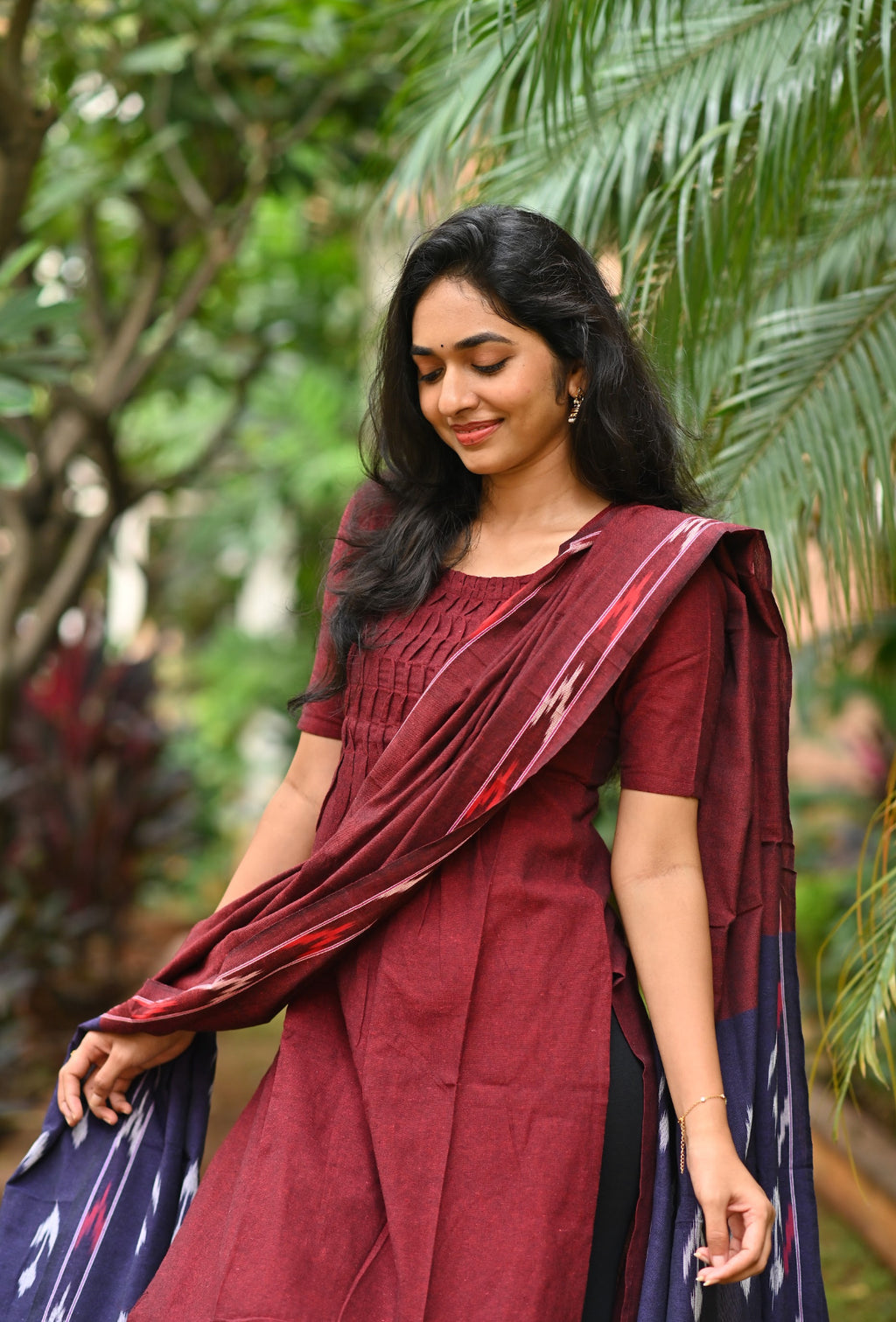 Handloom solid double yarn kurti with woven ikkat dupatta
