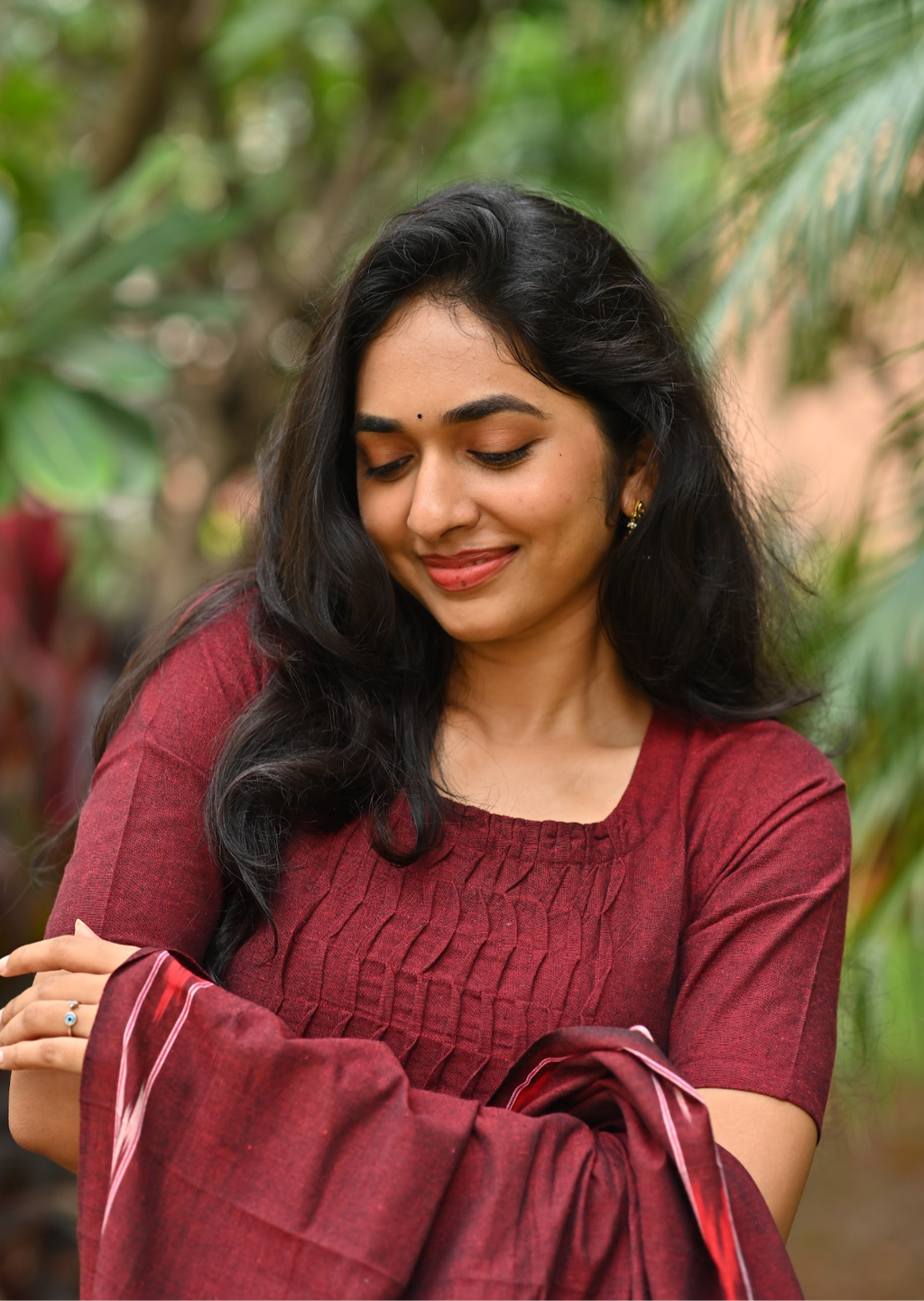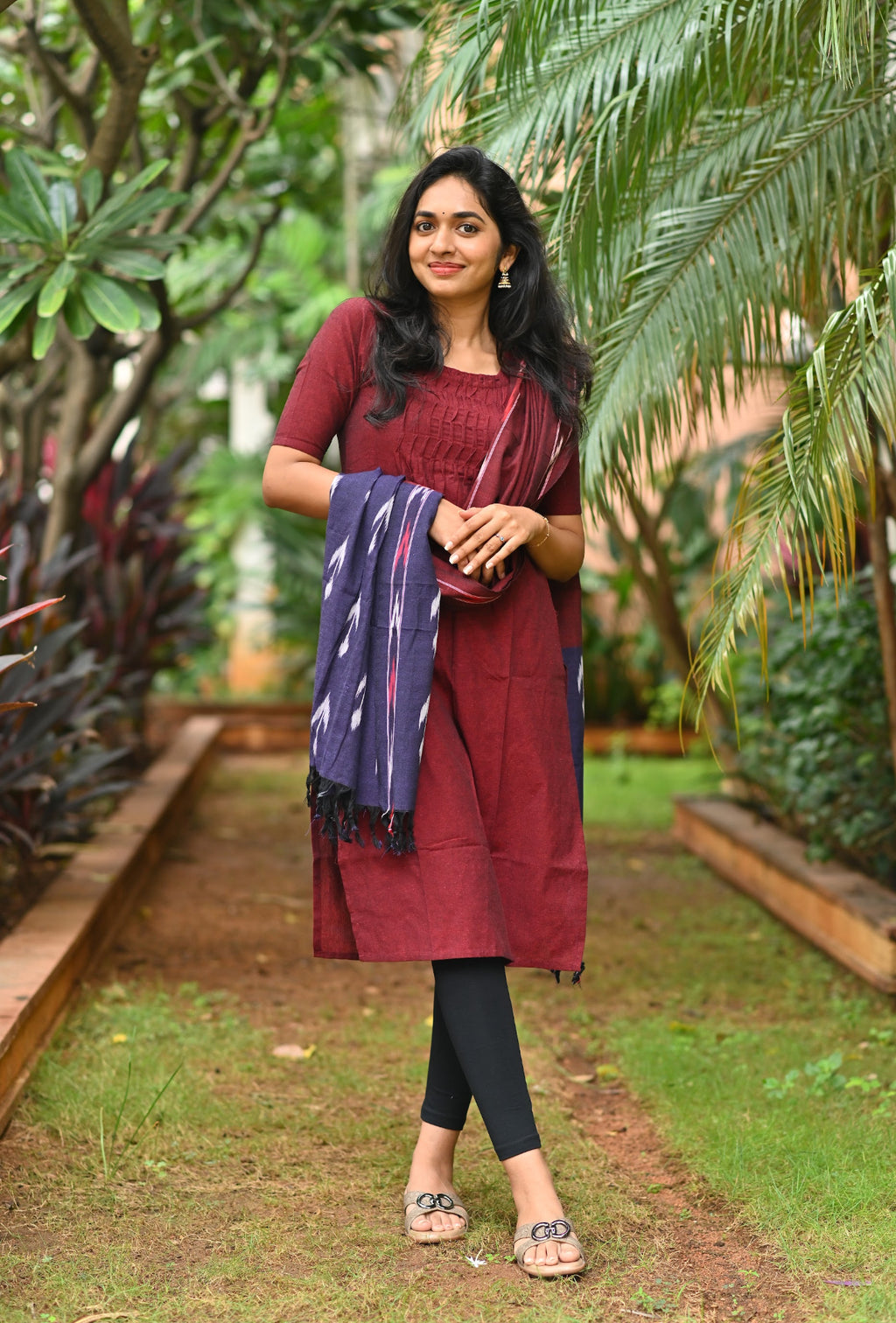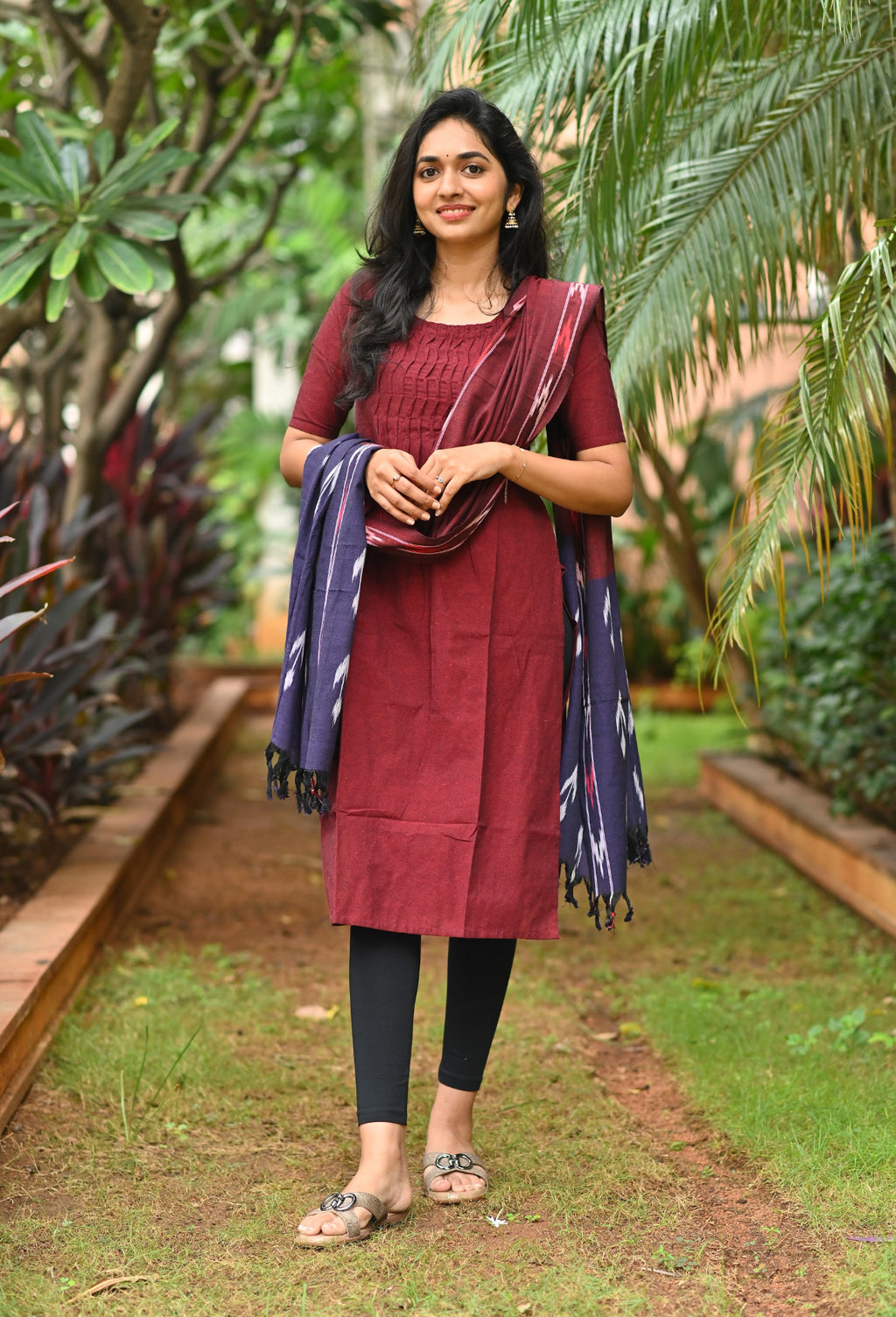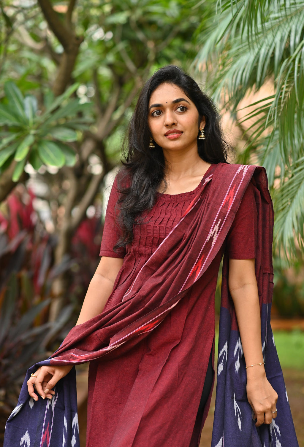 Handloom solid double yarn kurti with woven ikkat dupatta