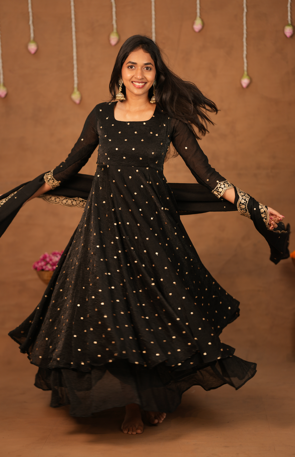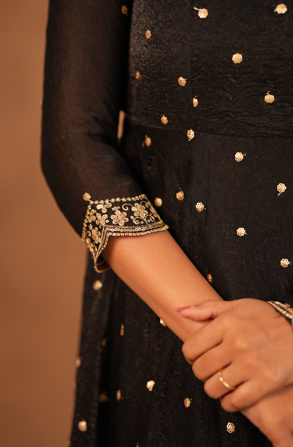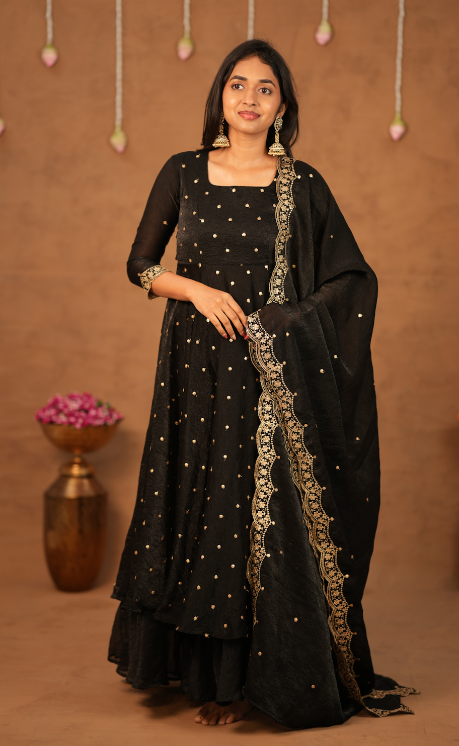 Space silk crushed with heavy butti comes in a pa neckline and and attached cotton lining paired with full flared 2-tier solid crushed space silk gown