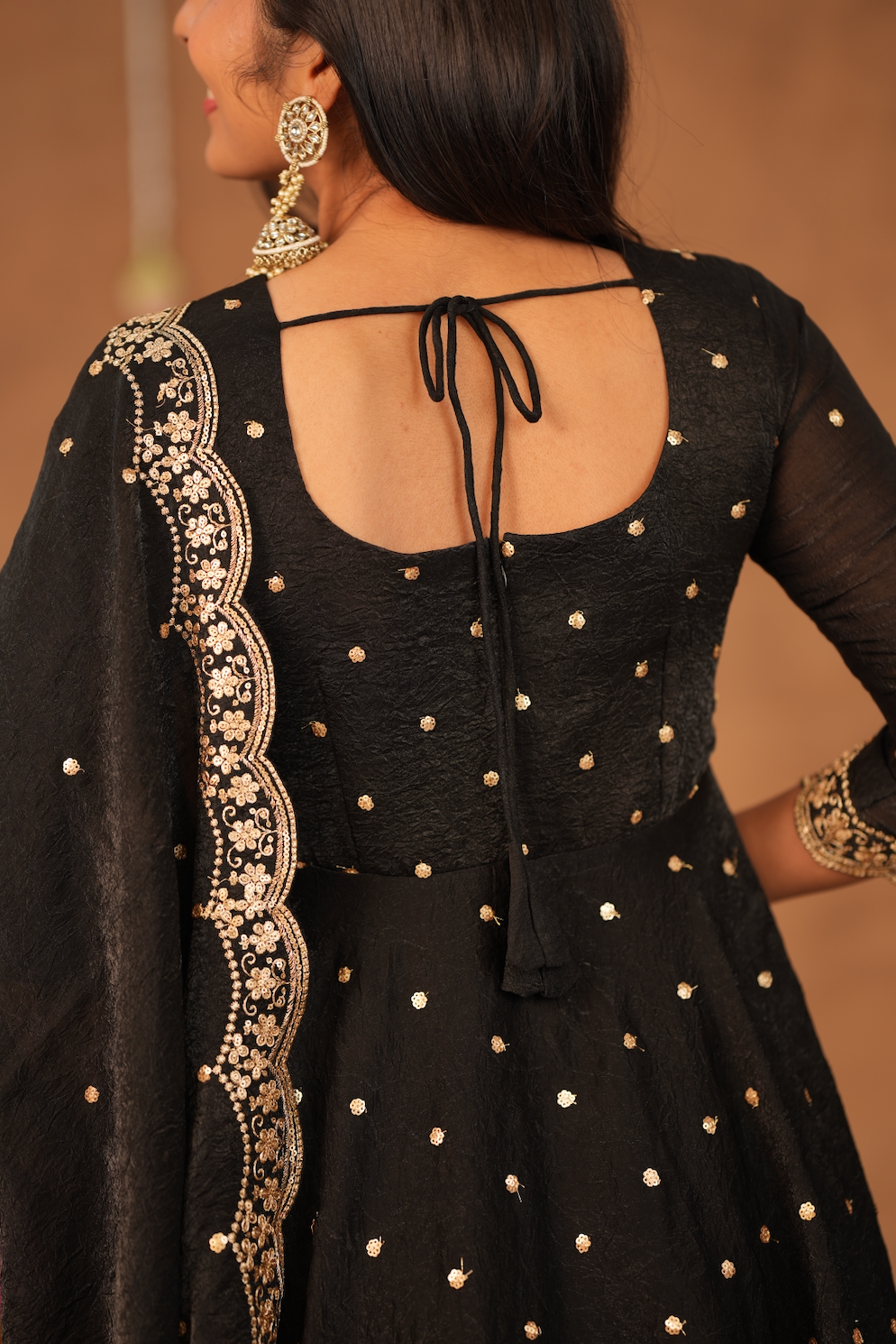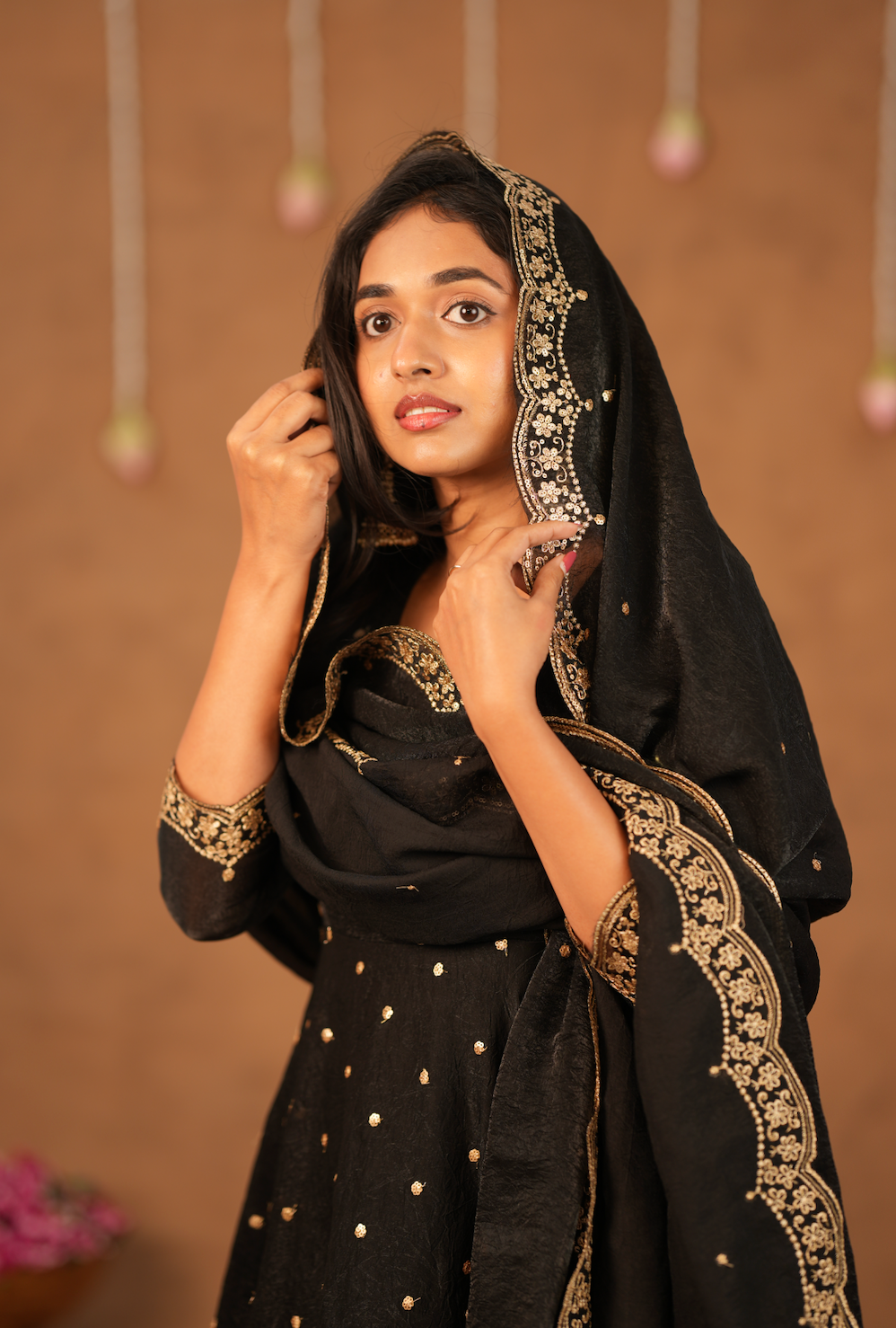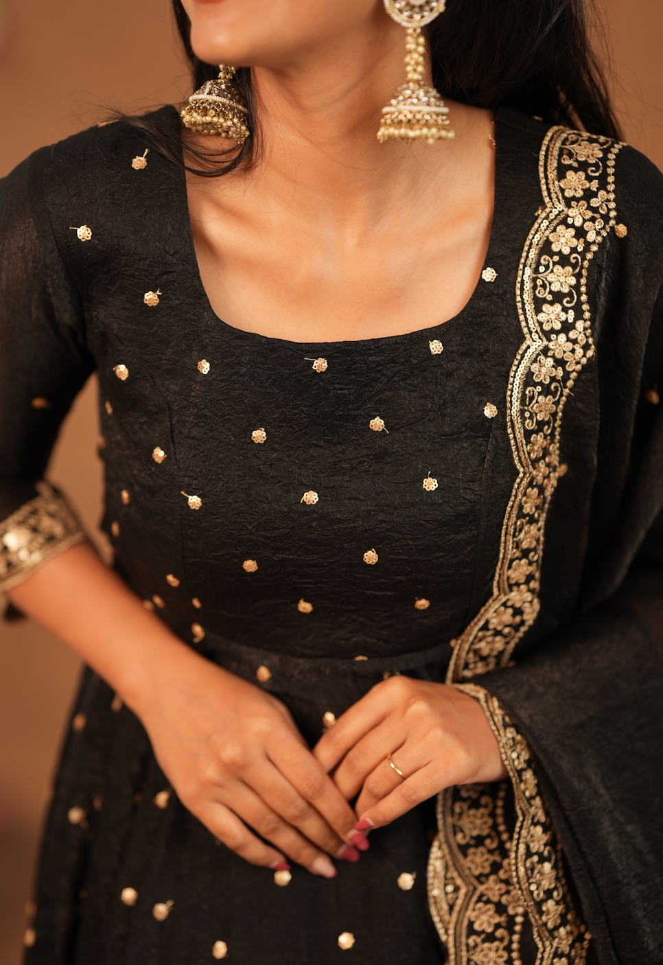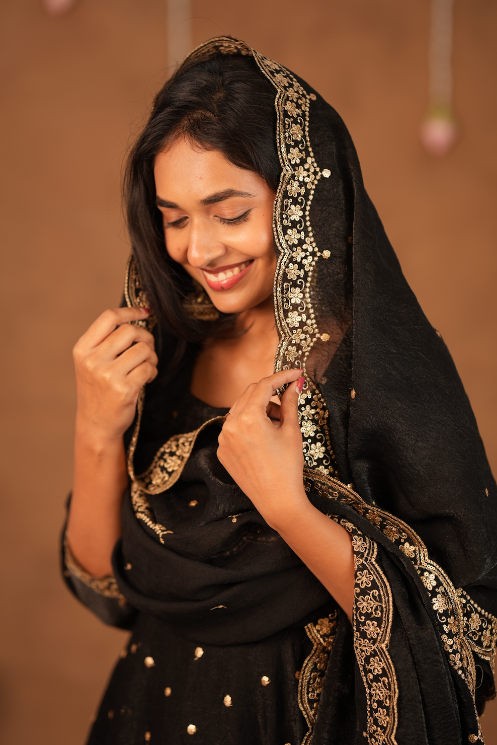 Space silk crushed with heavy butti comes in a pa neckline and and attached cotton lining paired with full flared 2-tier solid crushed space silk gown