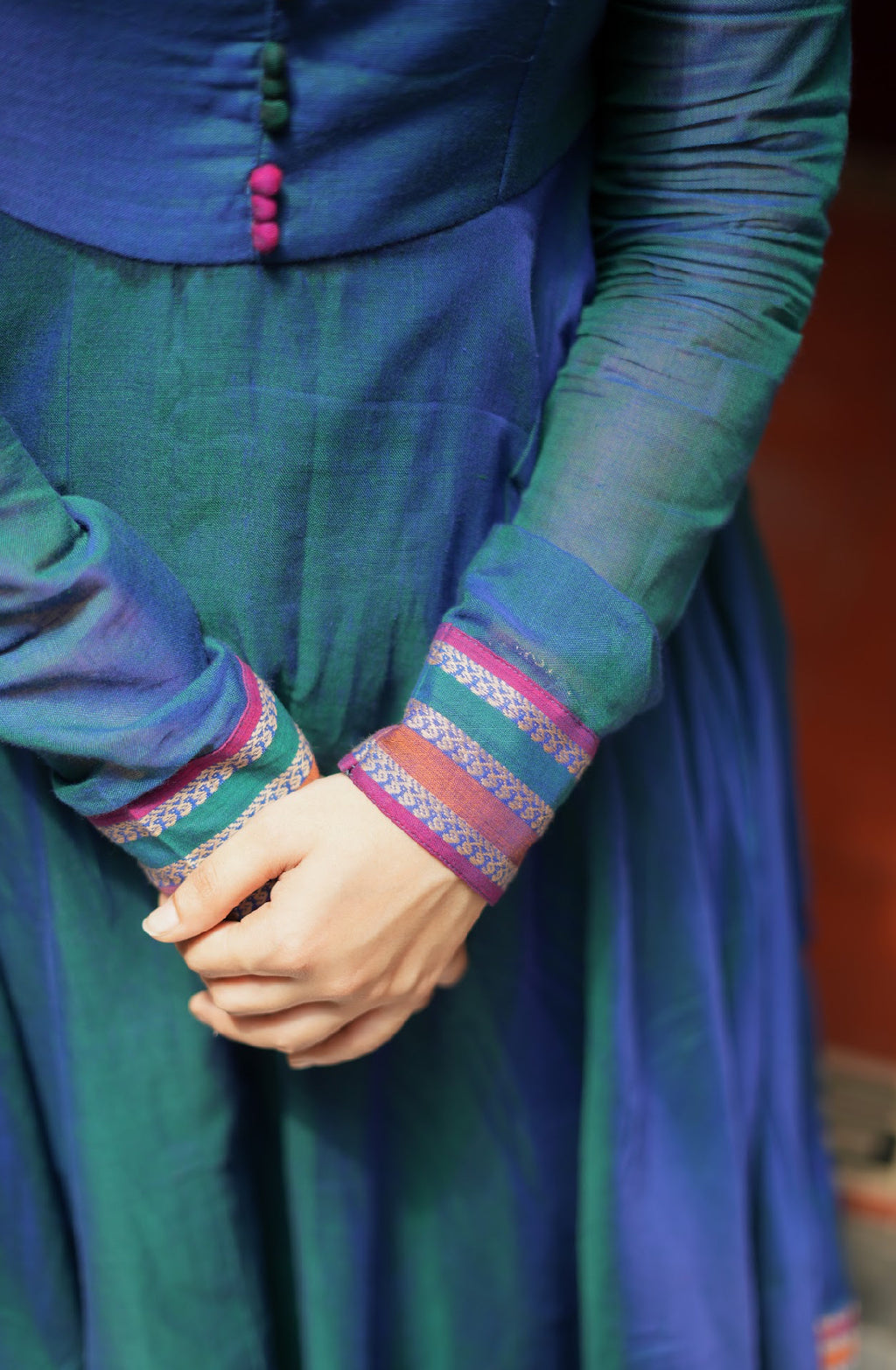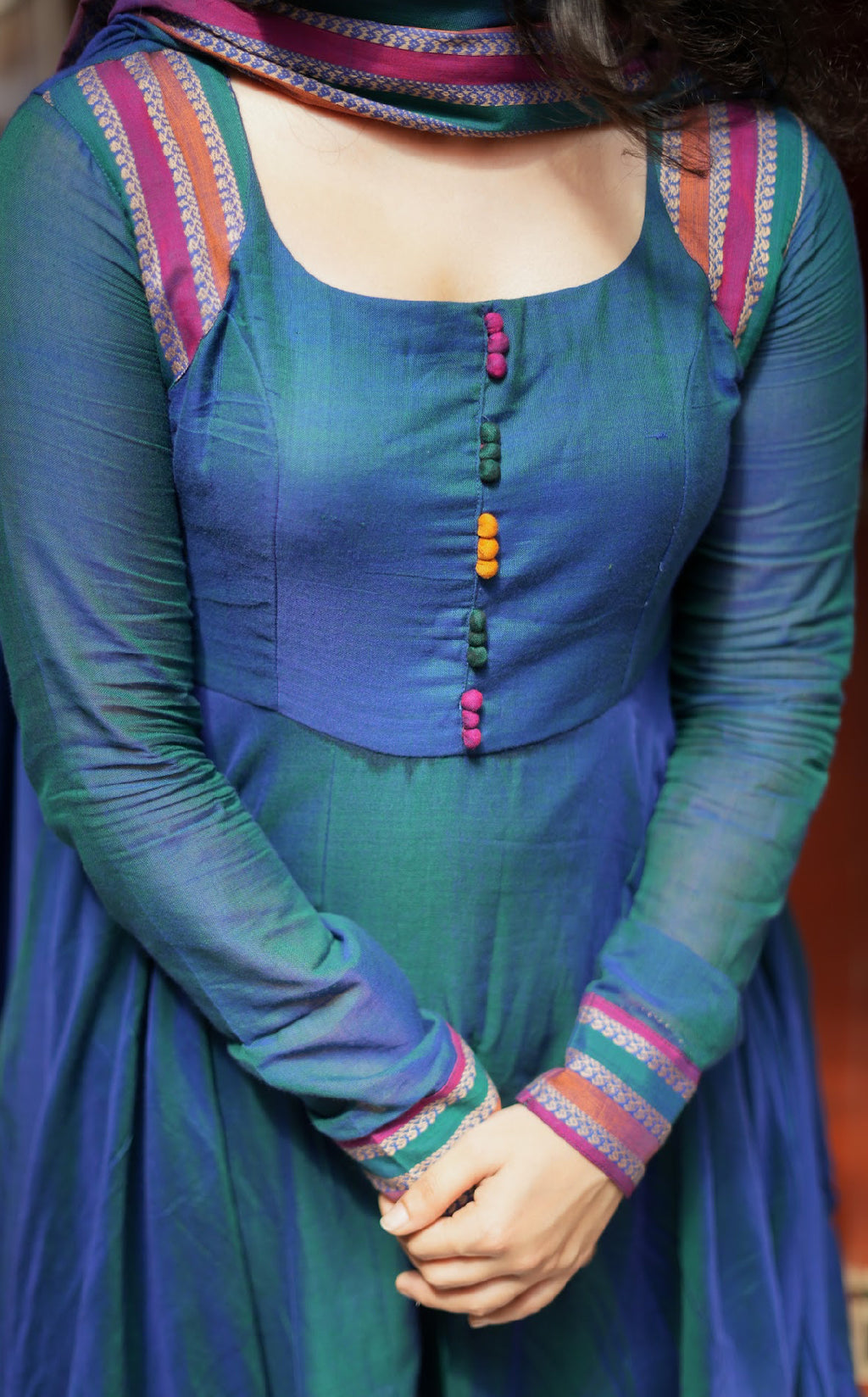 Multi color border design woven reference handloom Anarkali kurti with a striking temple big border and attached cotton lining