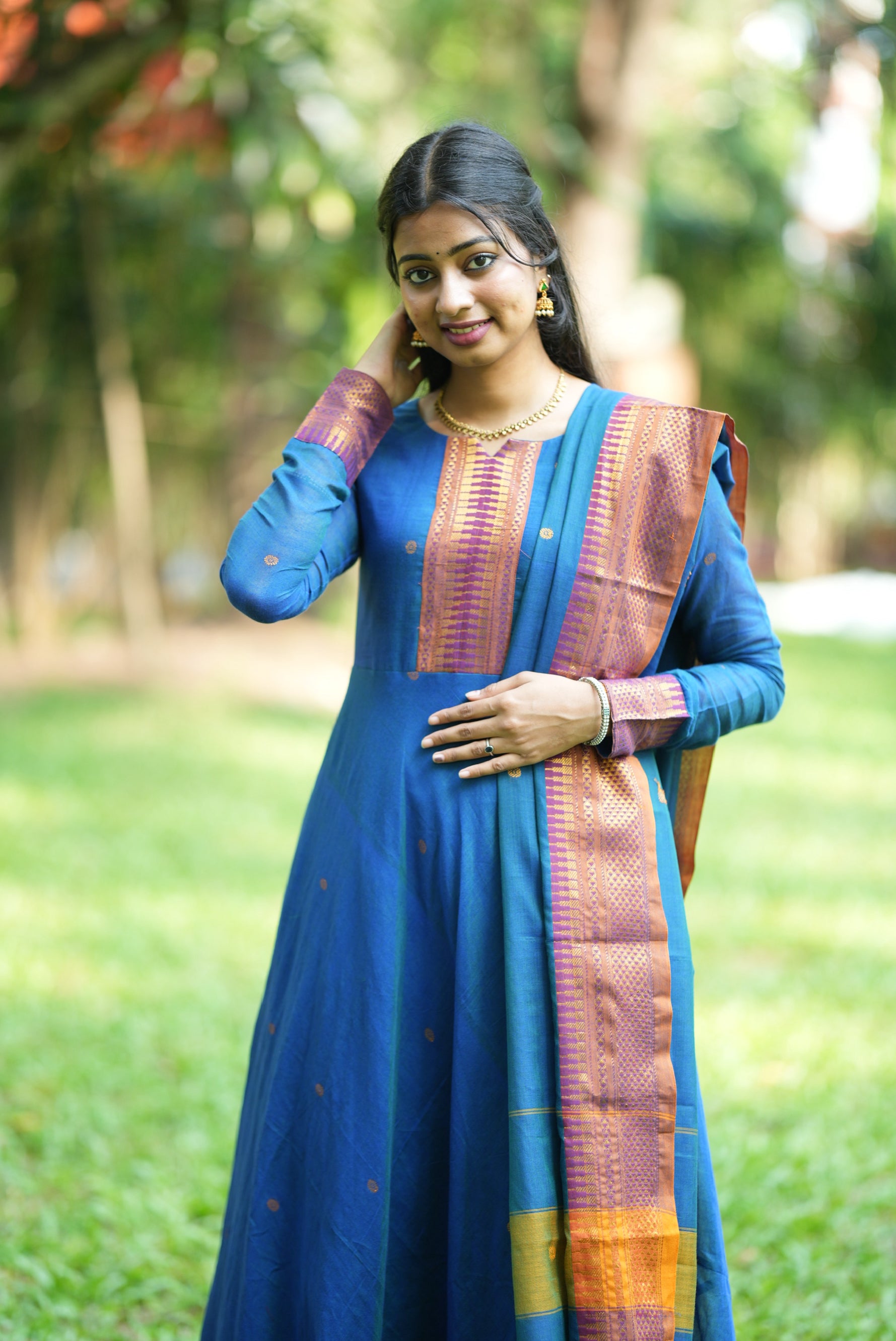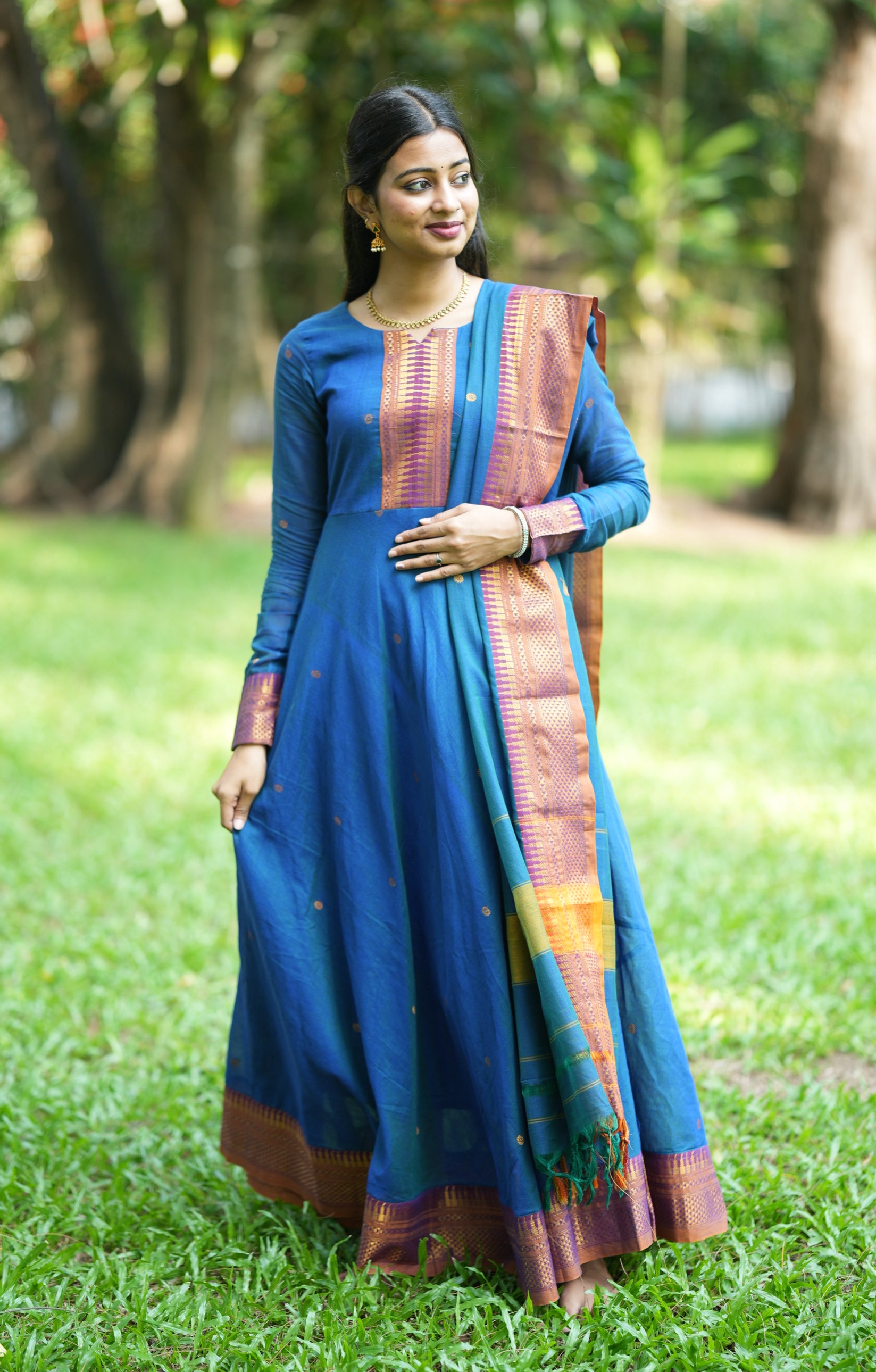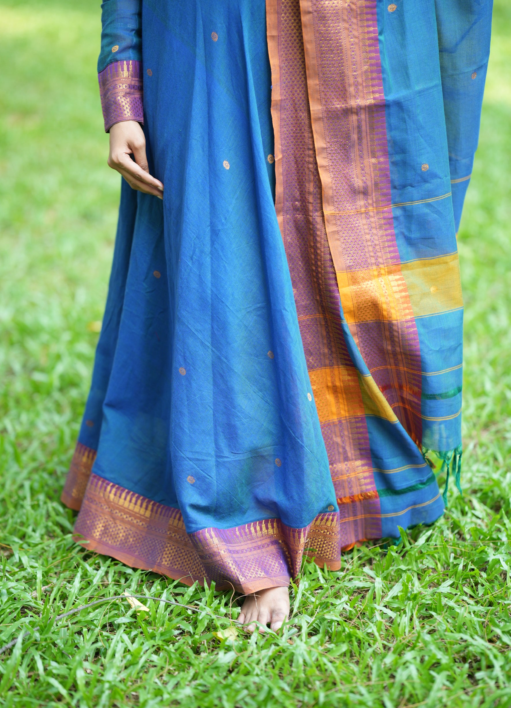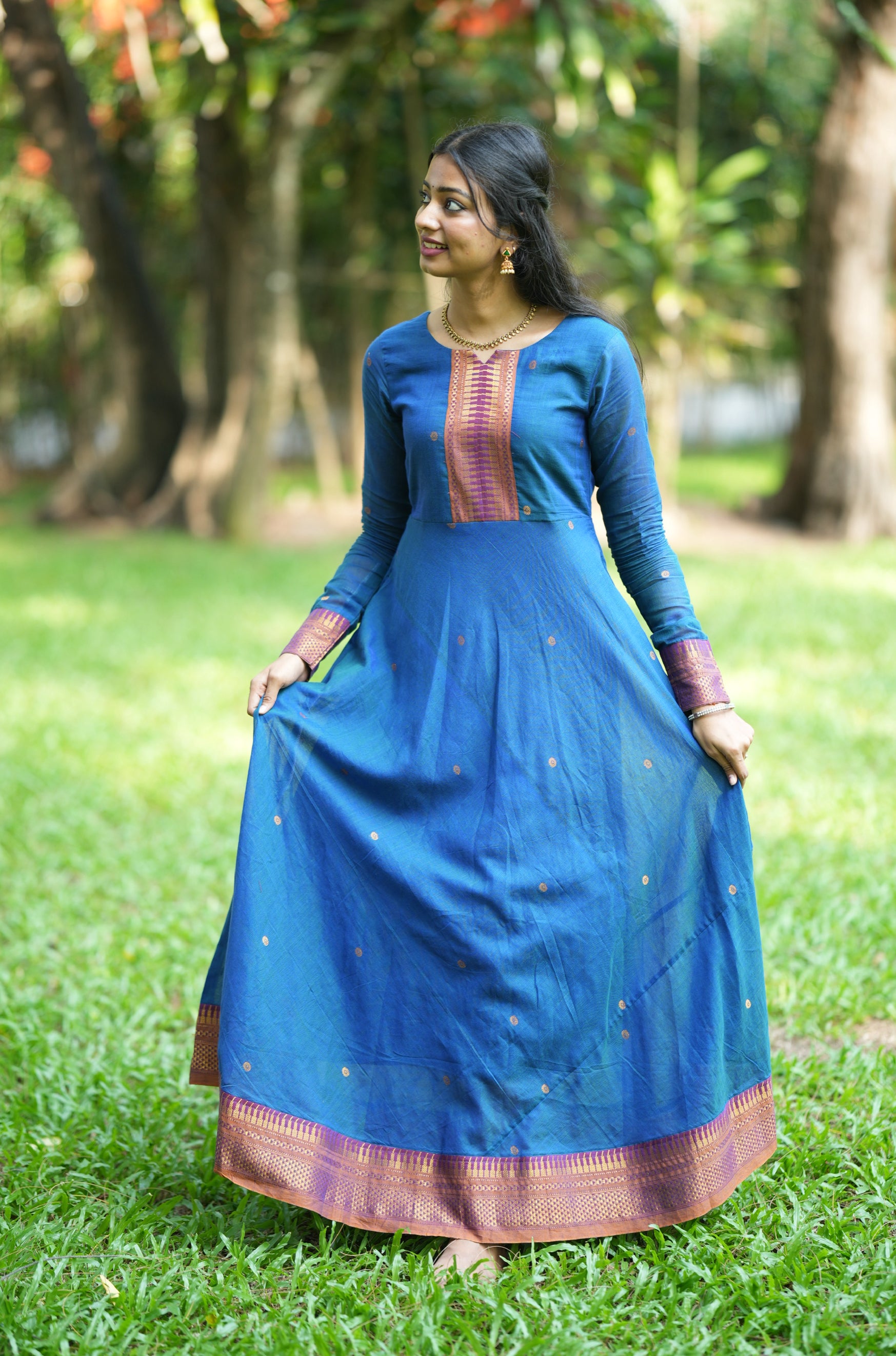 Karam border design woven reference handloom Anarkali kurti with a striking temple big border and attached cotton lining