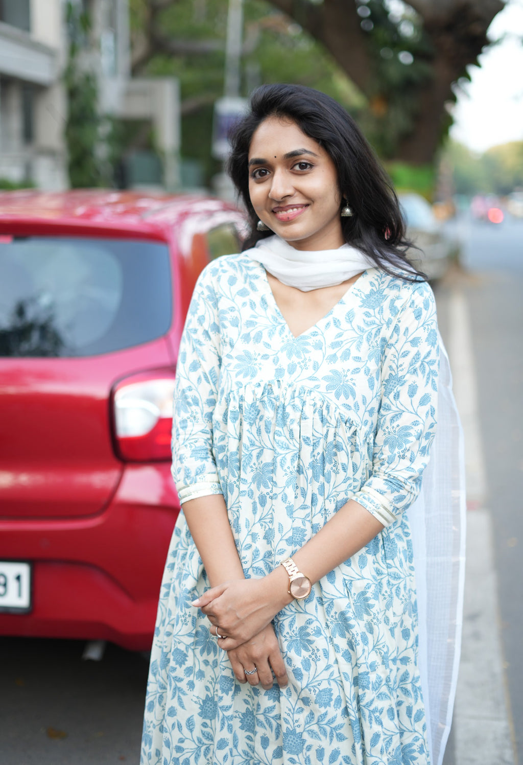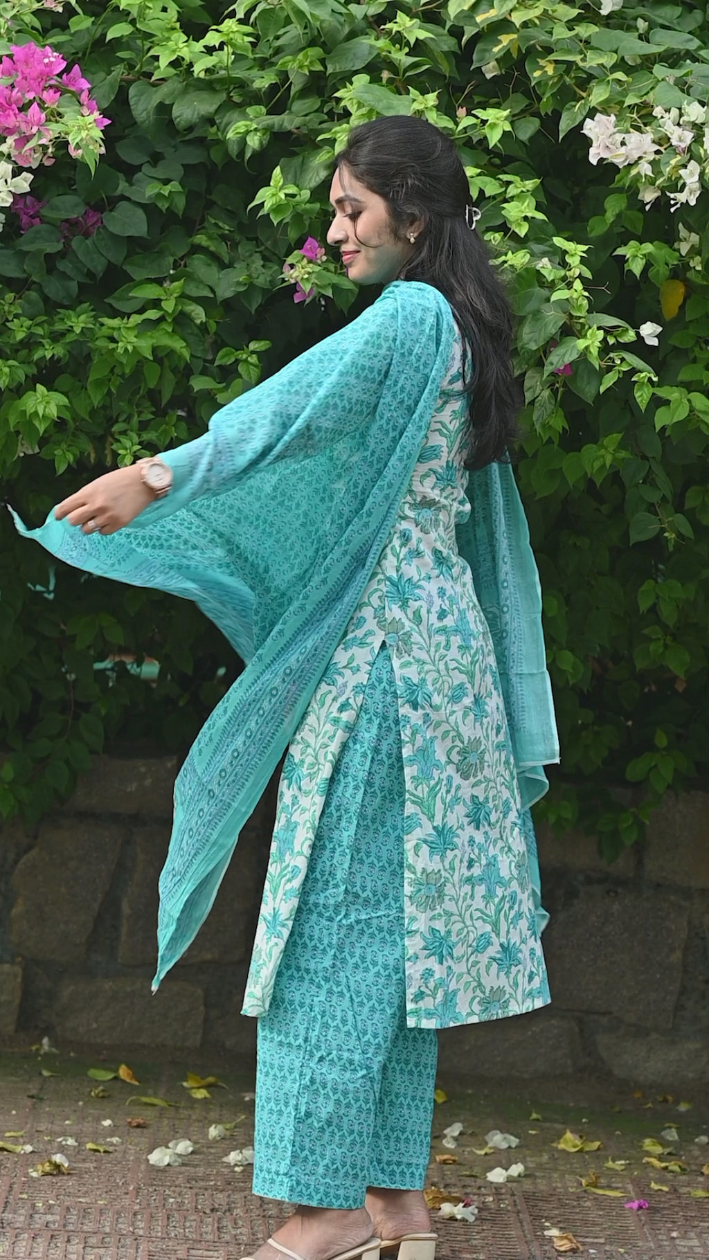 cotton Kurti with handwork detailing paired with straight cotton bottom and full size kota dupatta comes