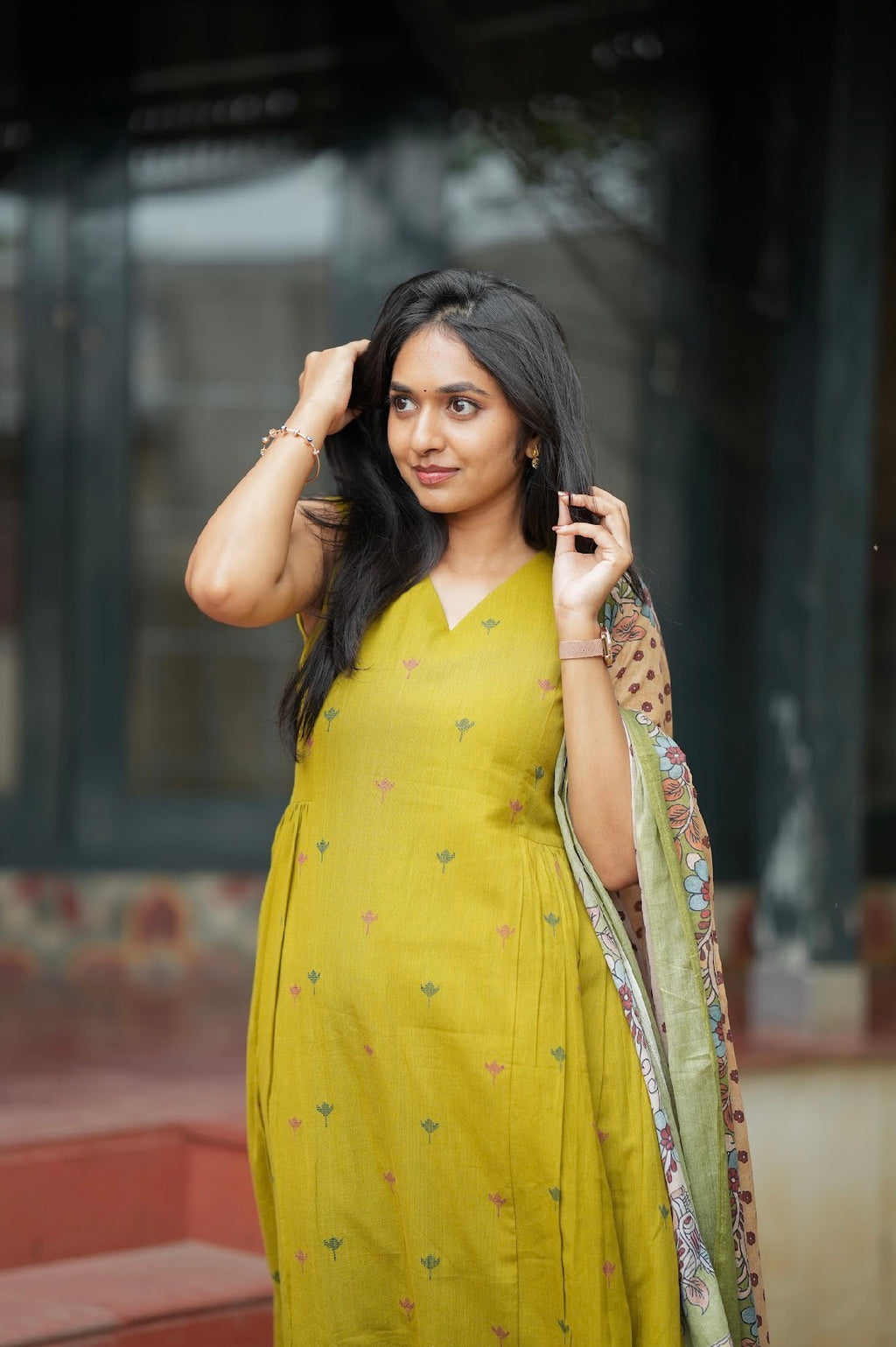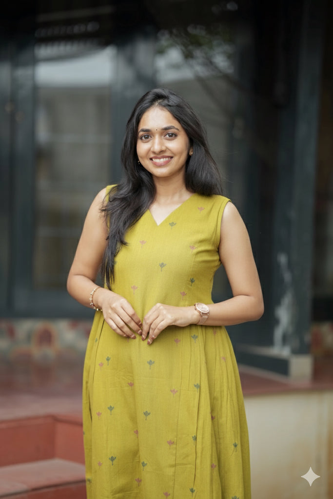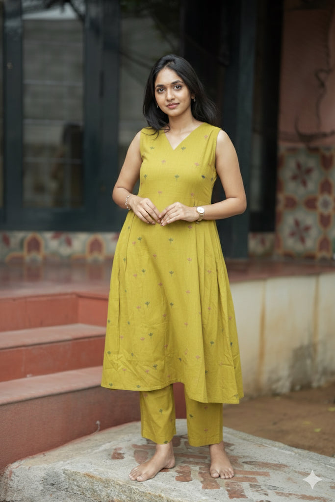 Fabric: Handwoven Jamdani in soft cotton or a linen blend for breathability.