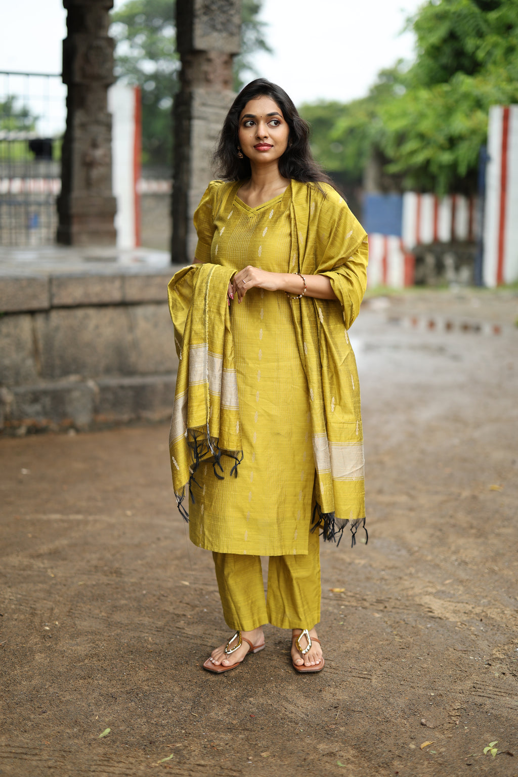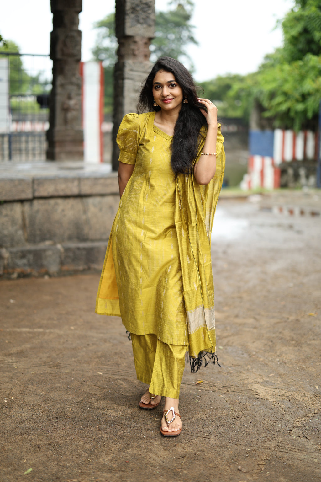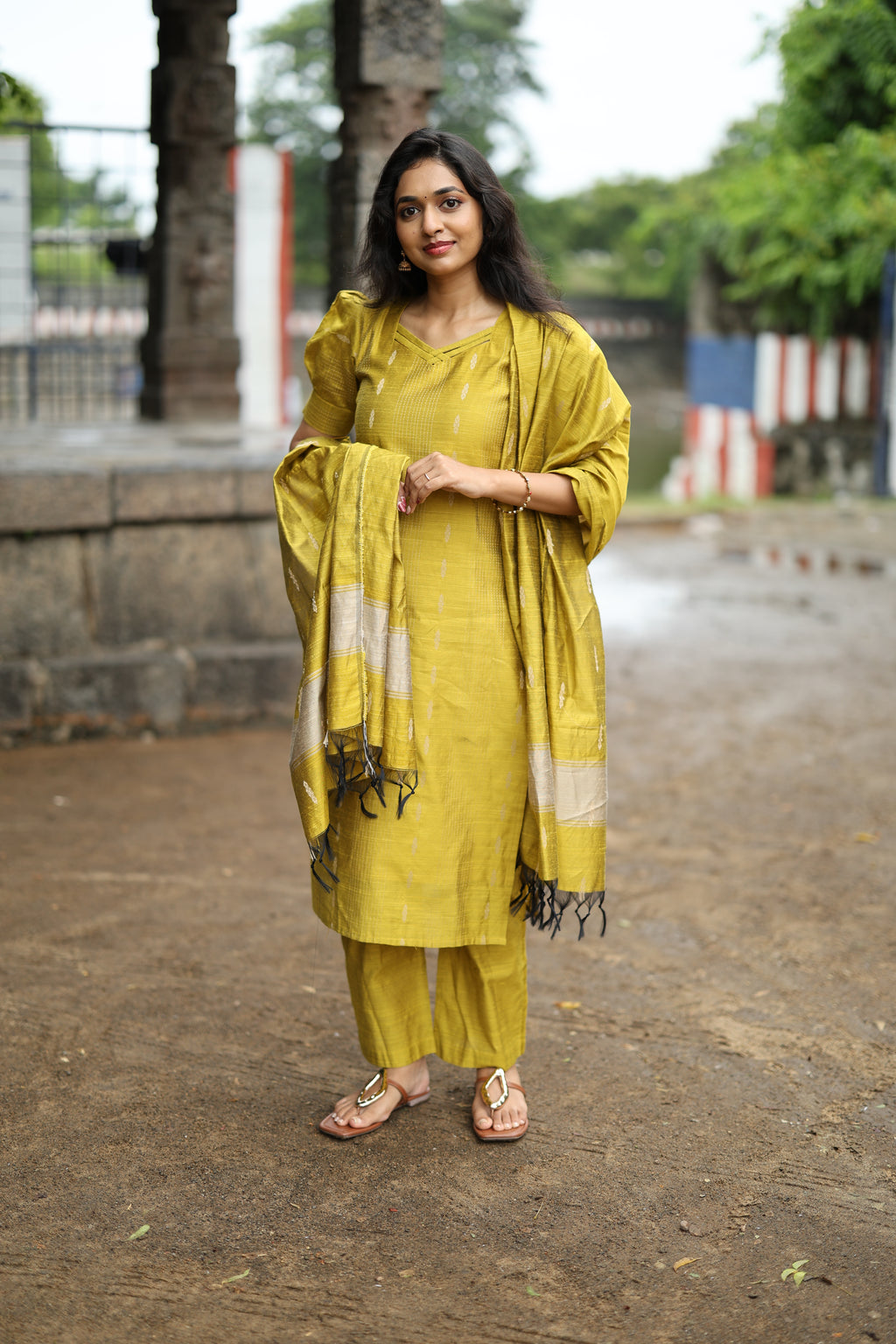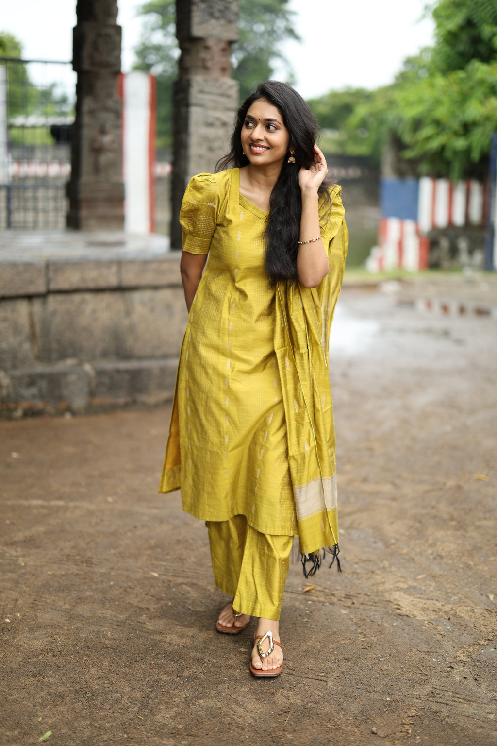 Provided with Frilled minimal collar neckline , and elbow length sleeves attached inside the kurta with a palazzo bottom and Full size dupatta