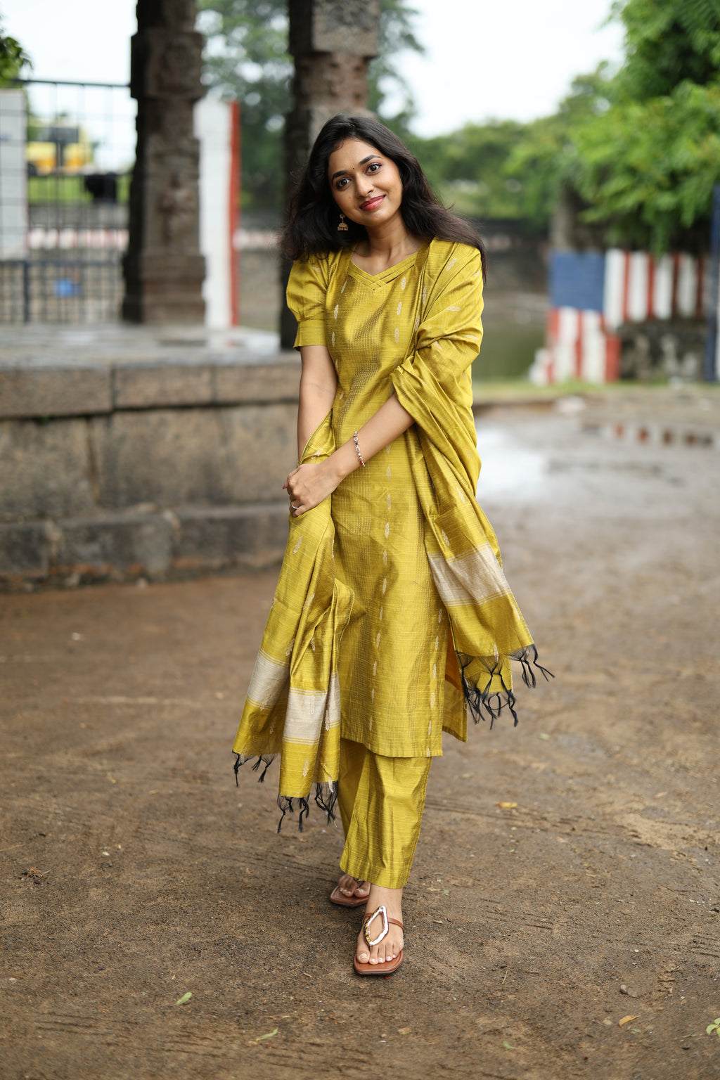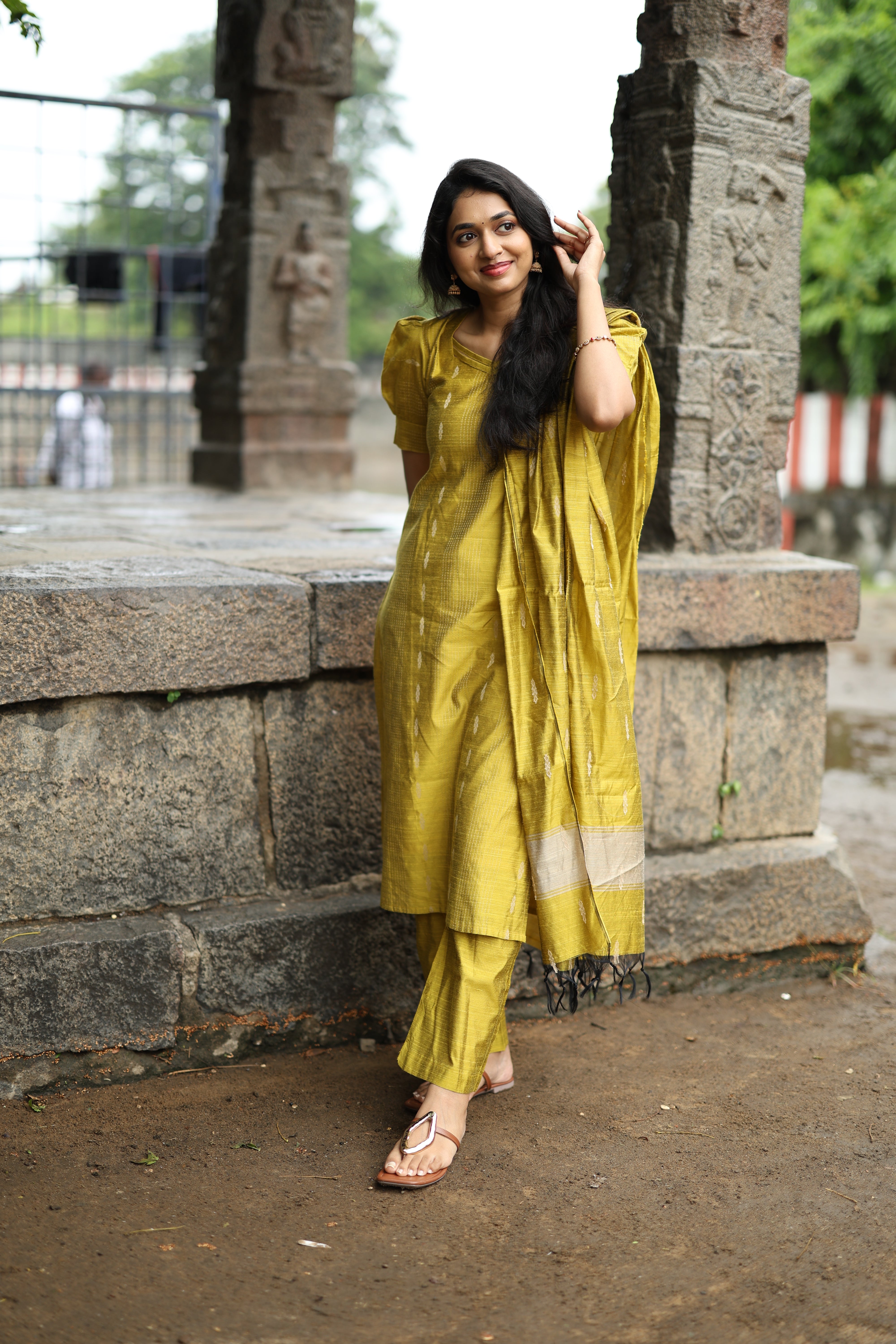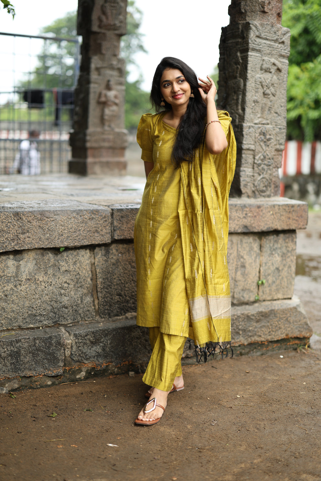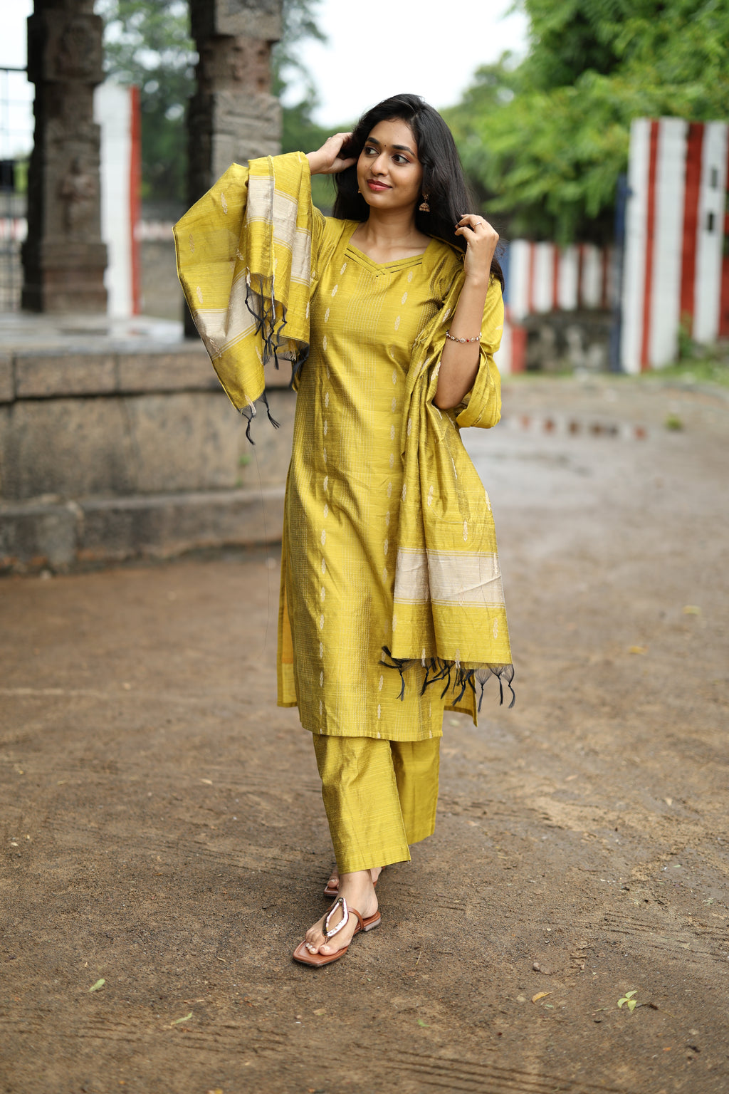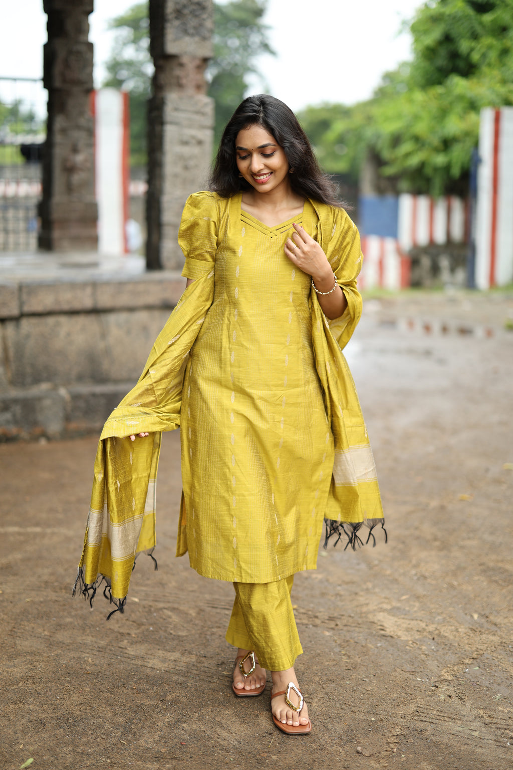 Provided with Frilled minimal collar neckline , and elbow length sleeves attached inside the kurta with a palazzo bottom and Full size dupatta