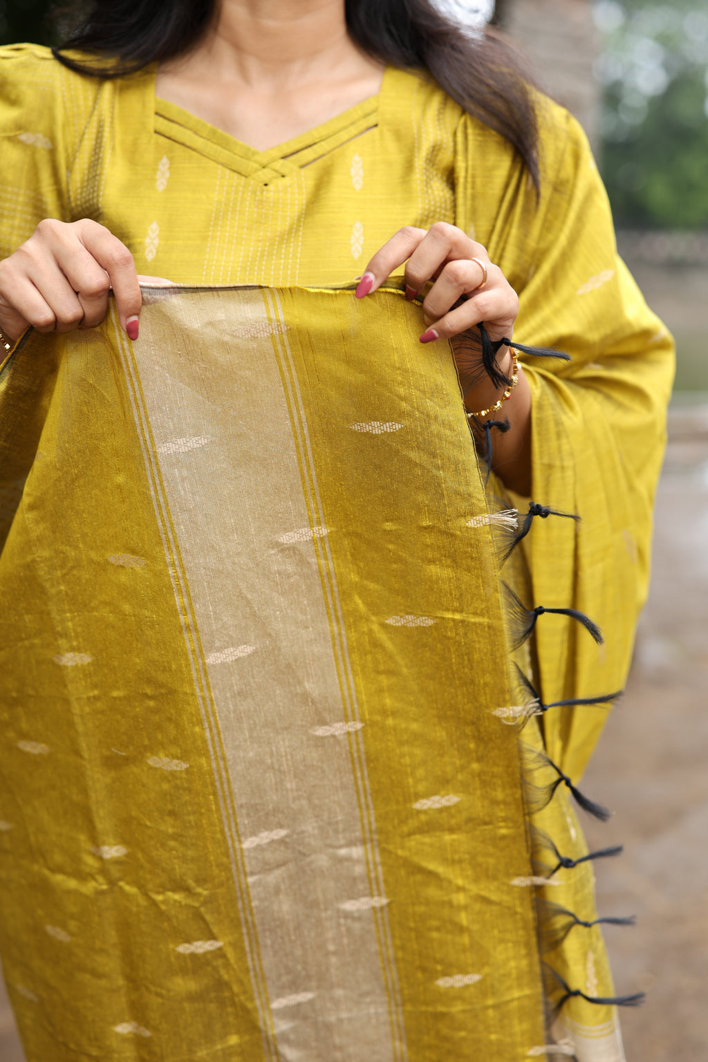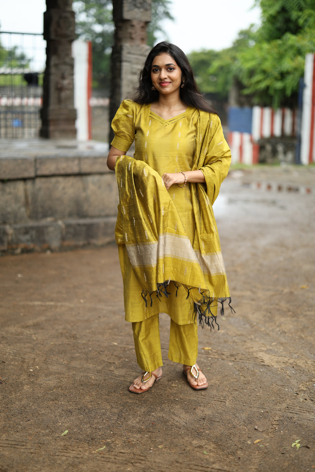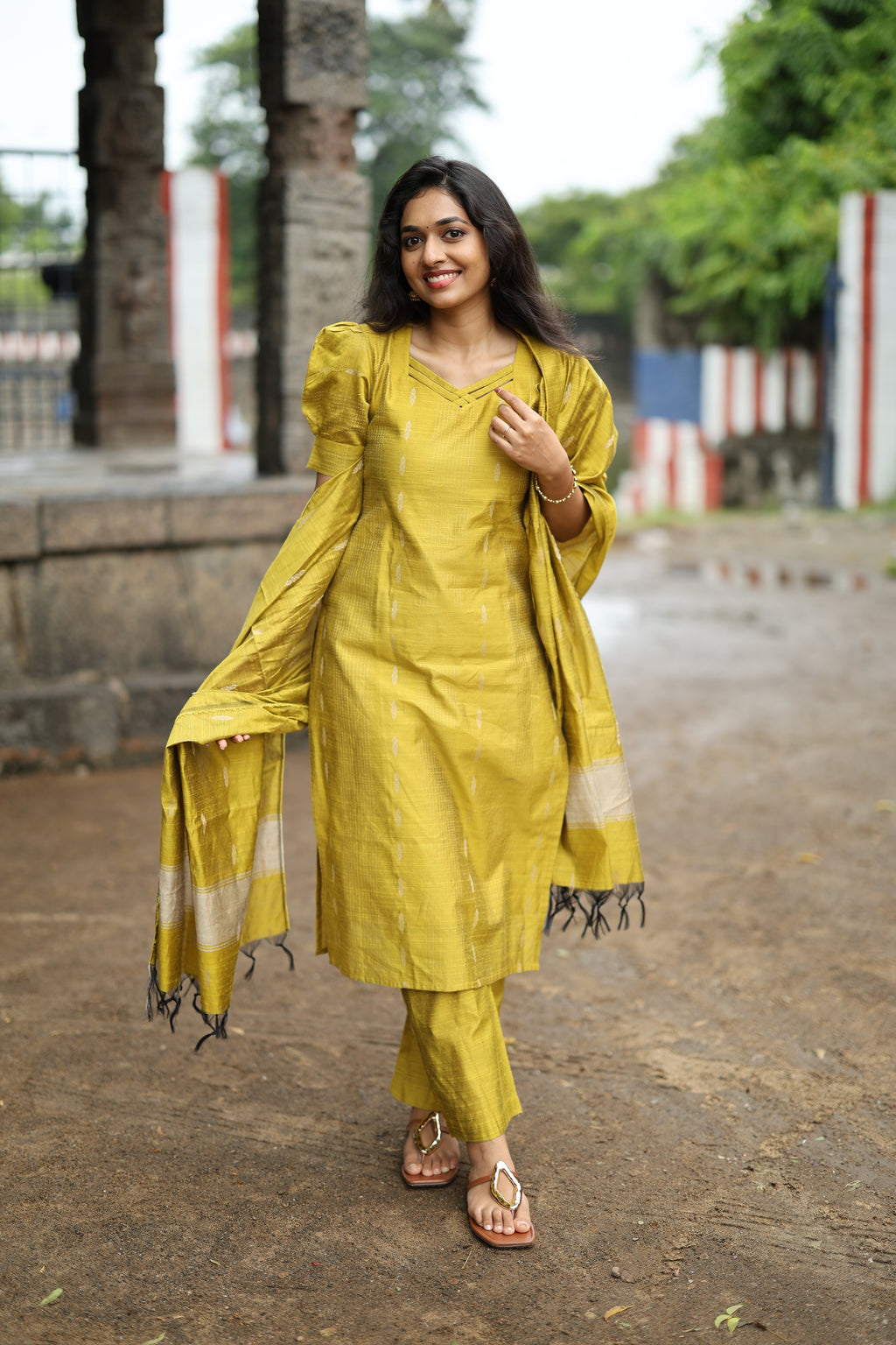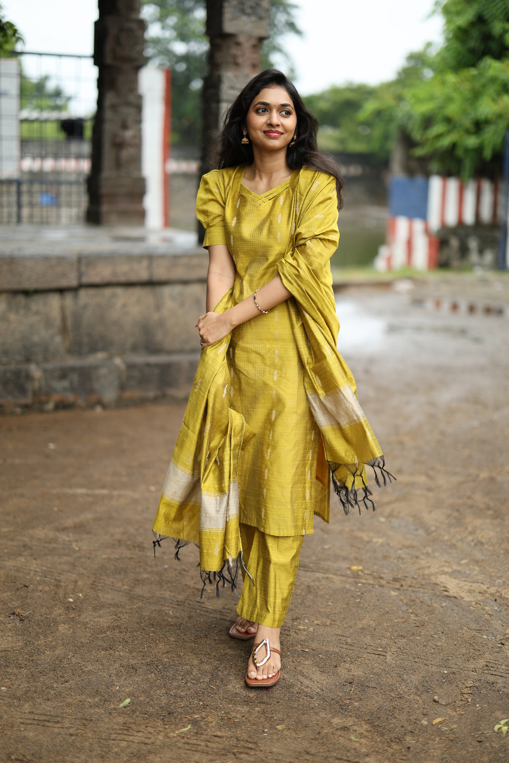 Provided with Frilled minimal collar neckline , and elbow length sleeves attached inside the kurta with a palazzo bottom and Full size dupatta