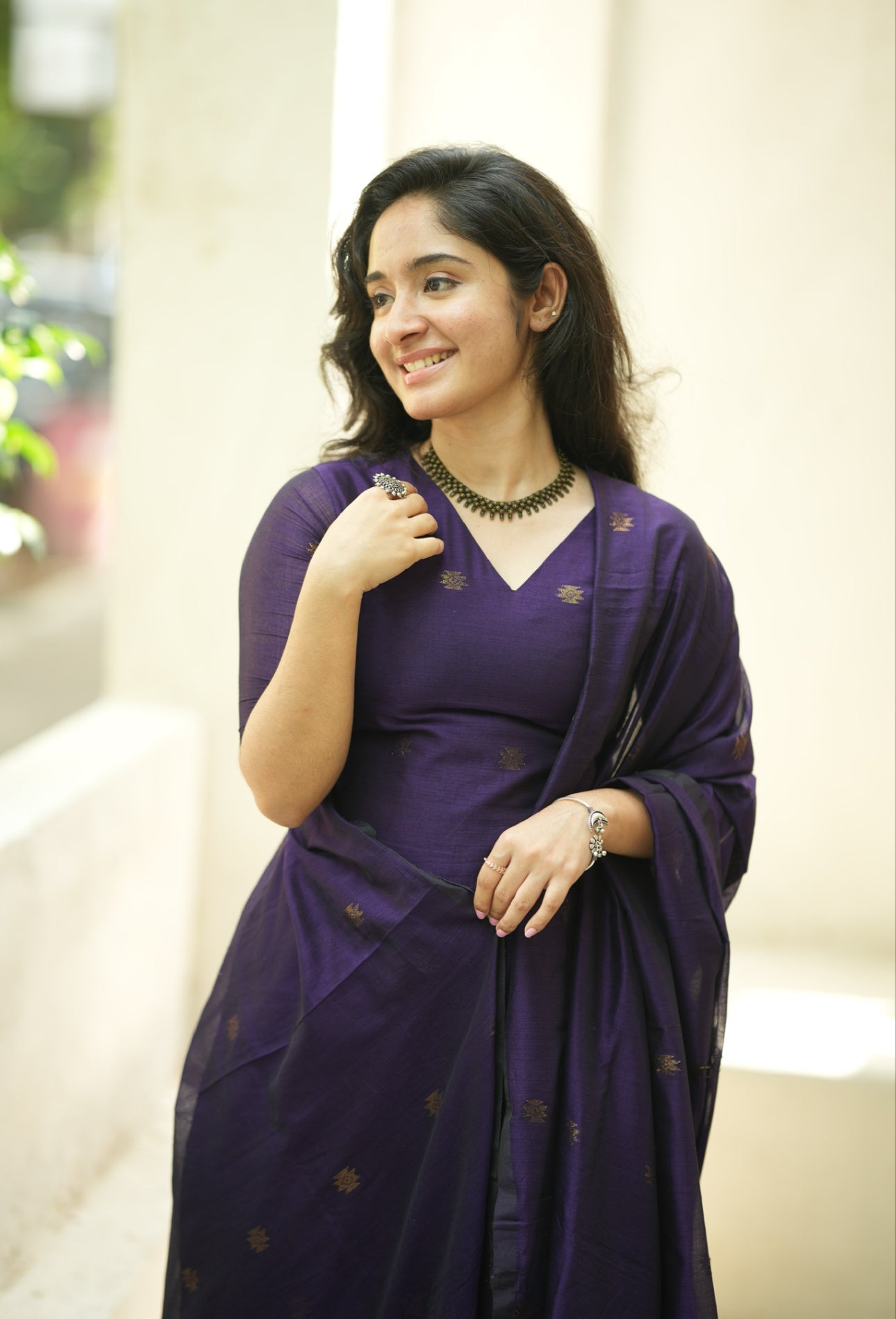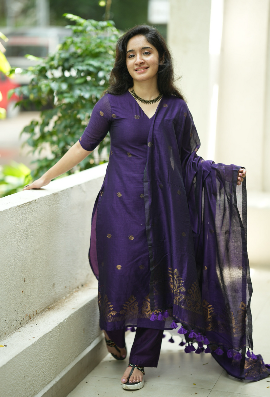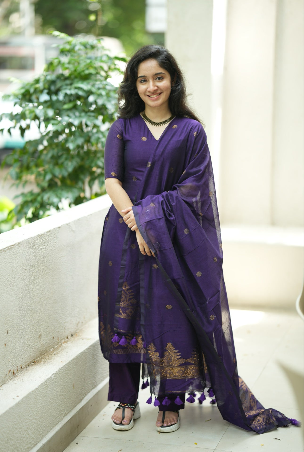 The monotone violet shade and woven copper floral pattern with small butta add a touch of sophistication.