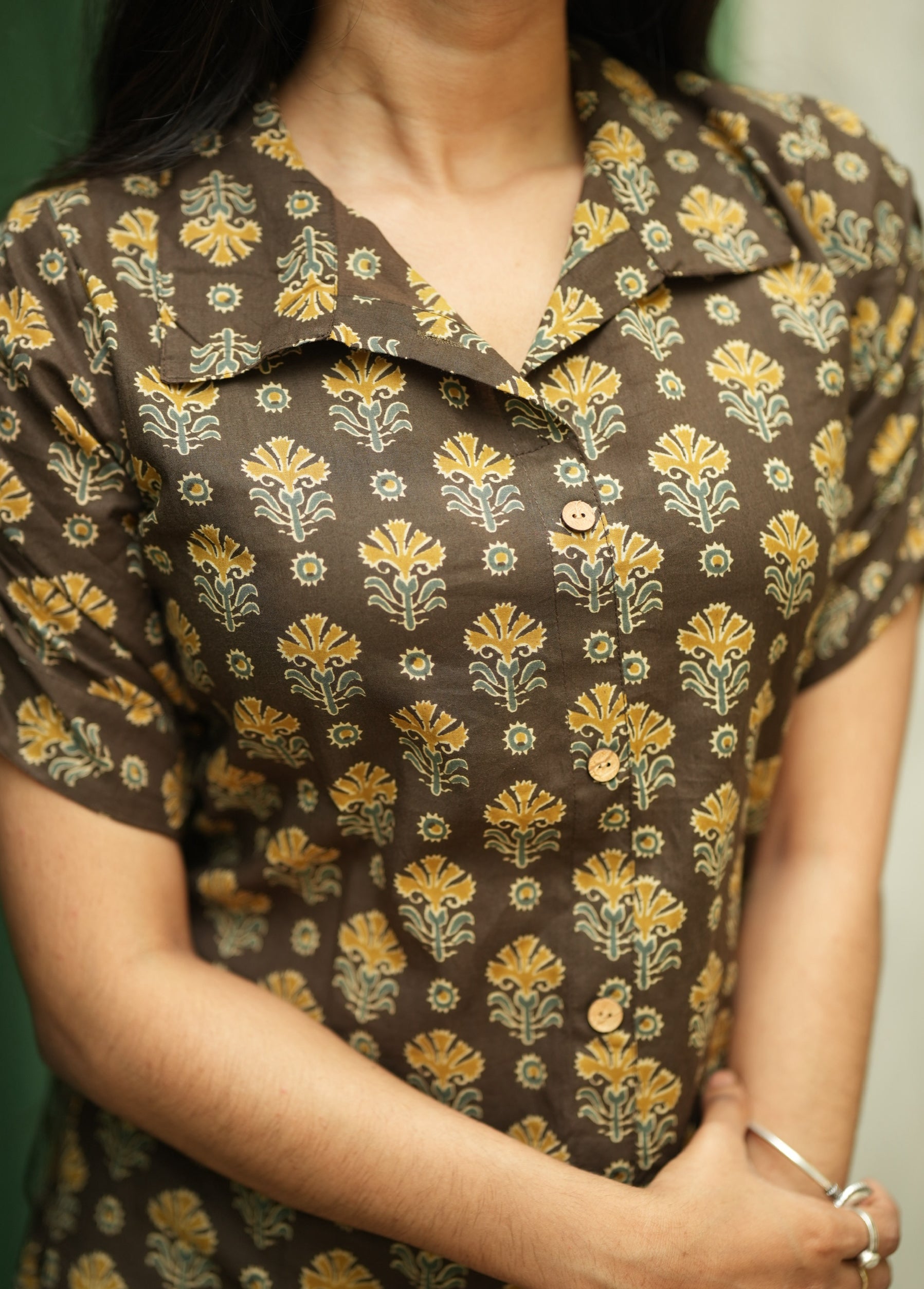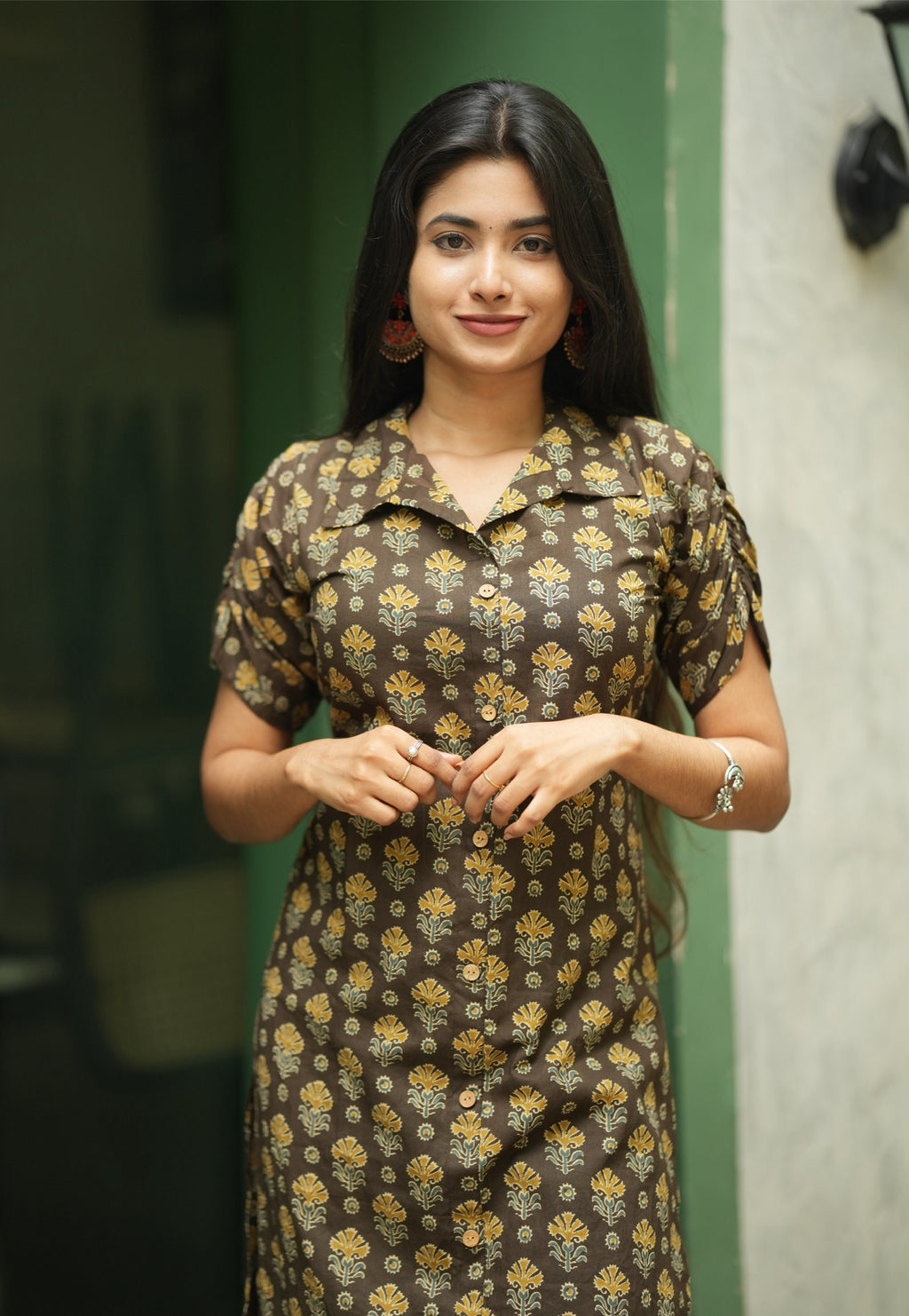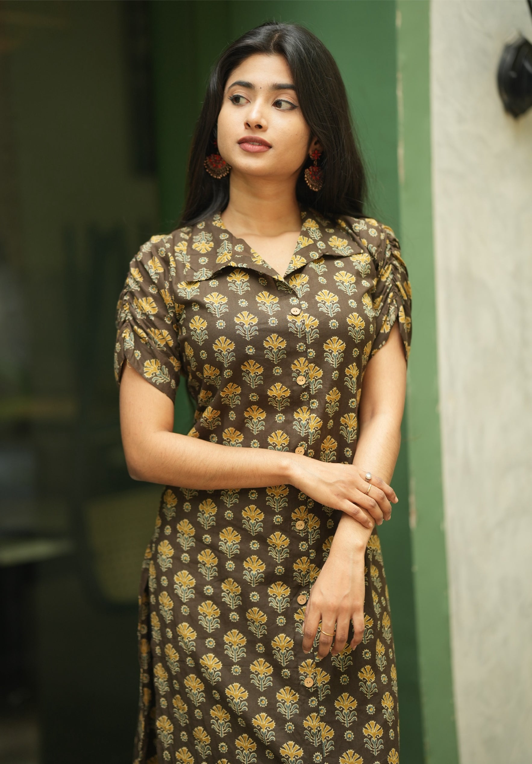kurti with elbow length fancy sleeve with gathering detailing and a minimal collared with wooden buttons