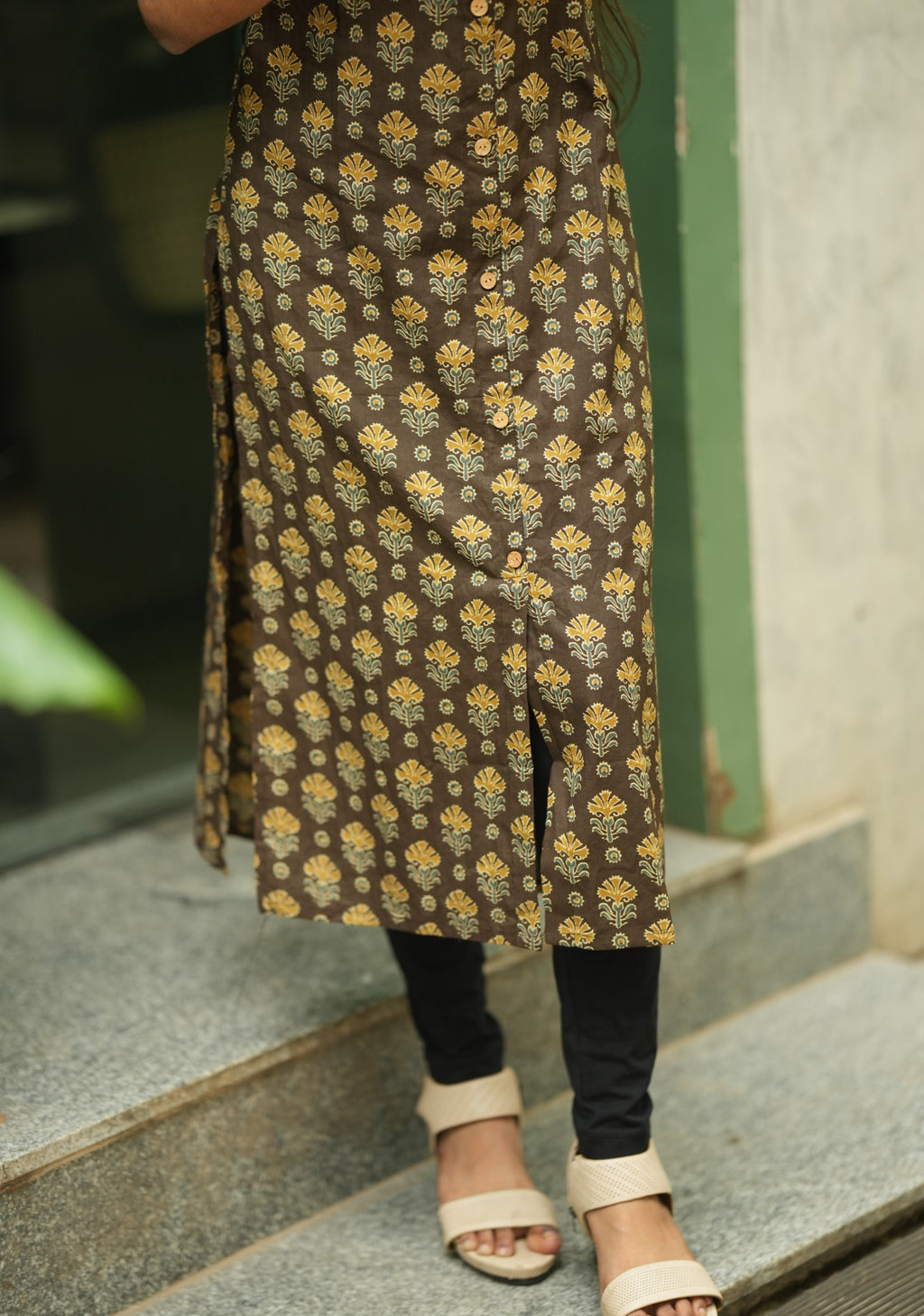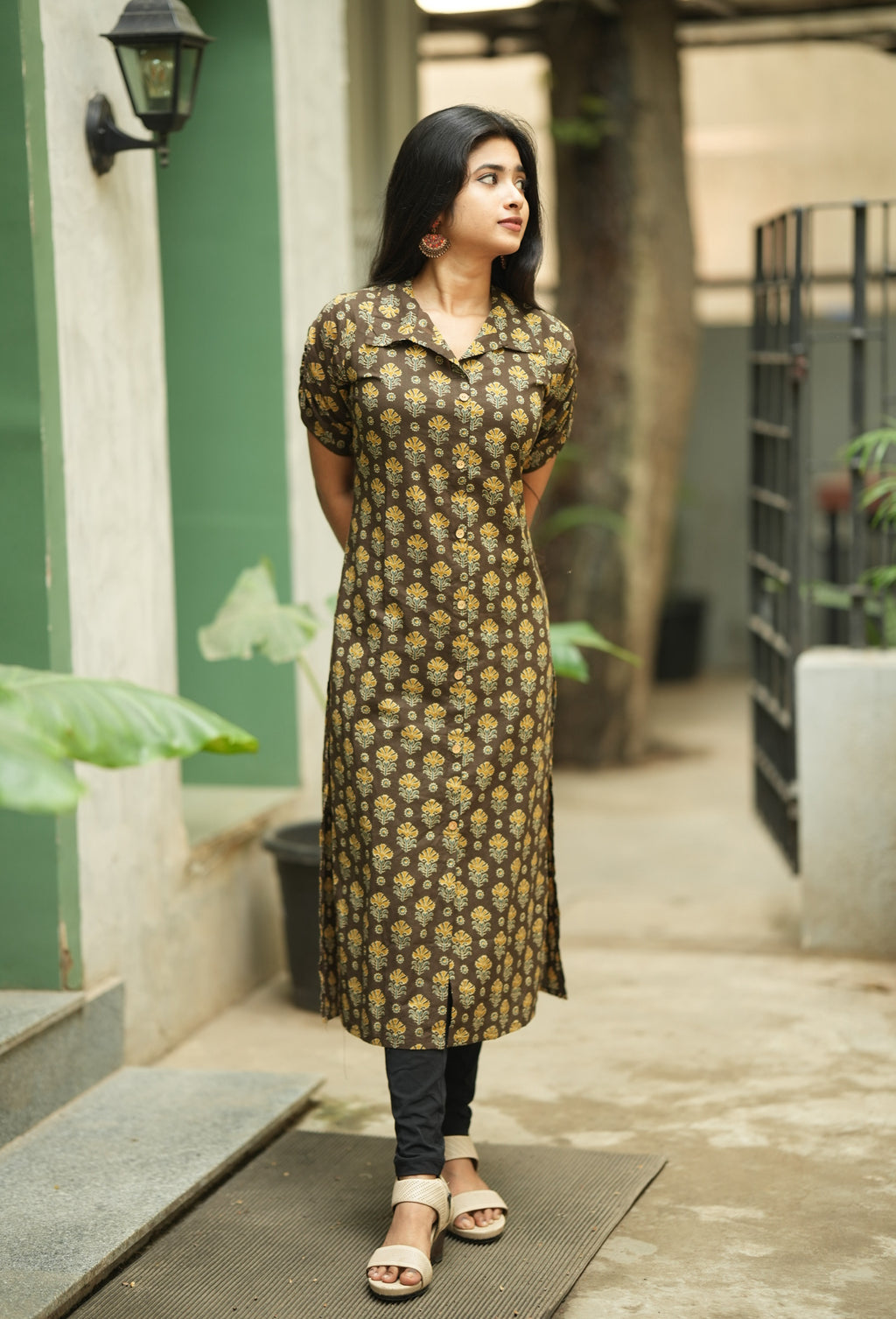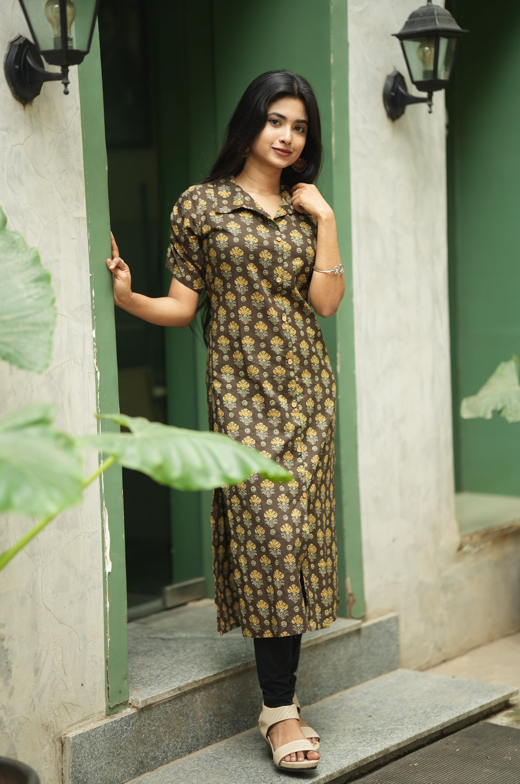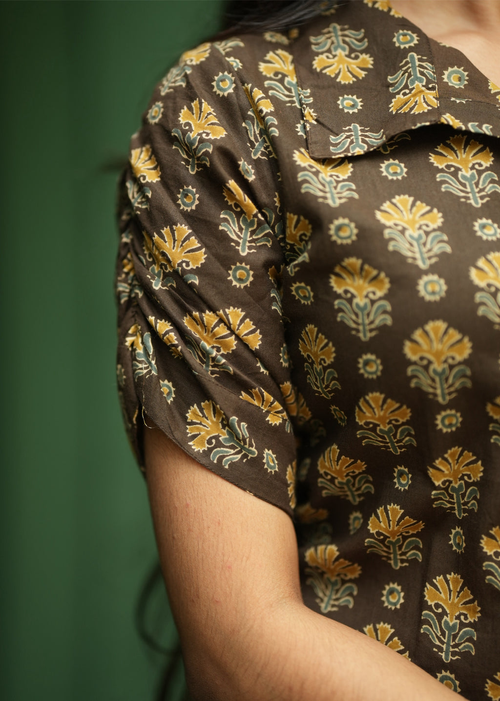 kurti with elbow length fancy sleeve with gathering detailing and a minimal collared with wooden buttons