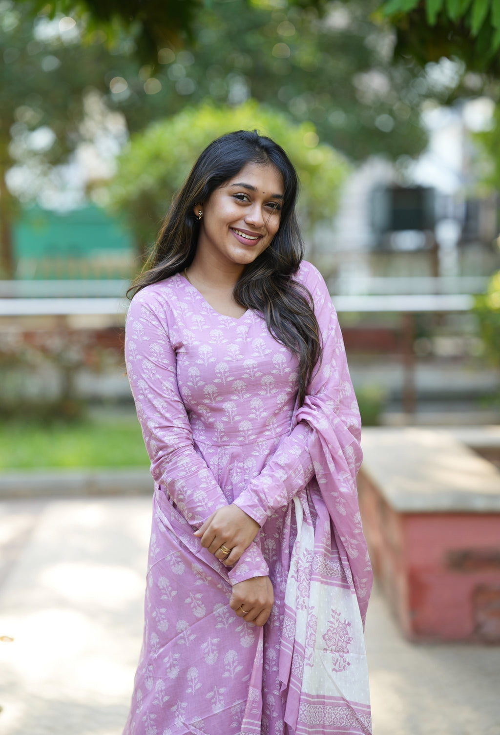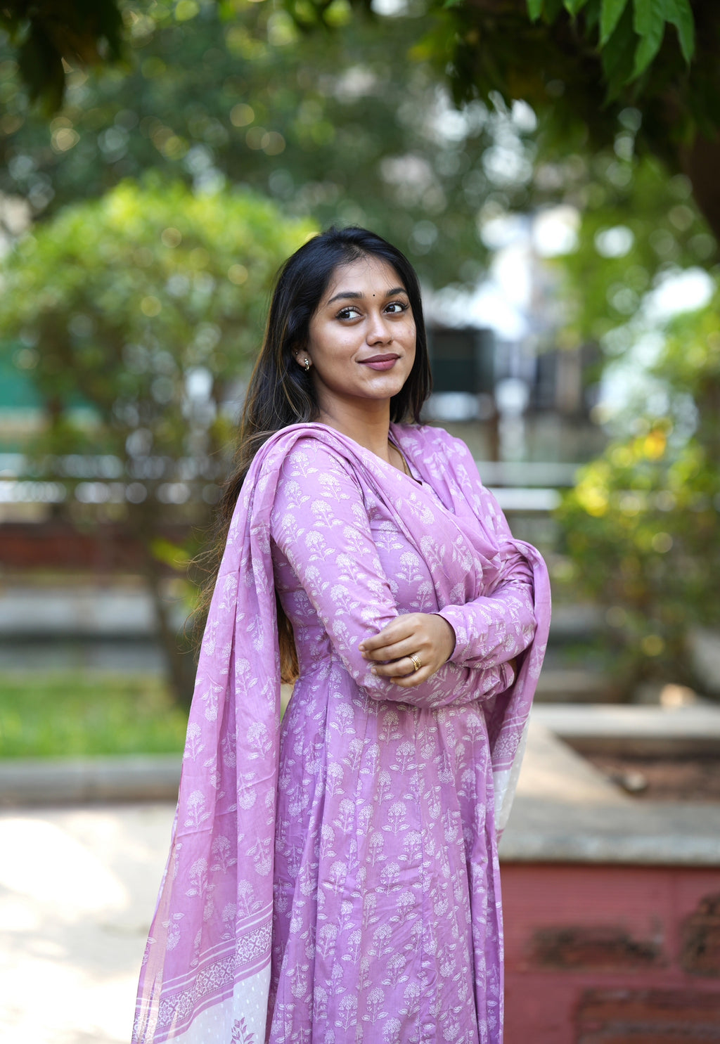 Block print organic cotton floral printed fit and flare anarkali suit set