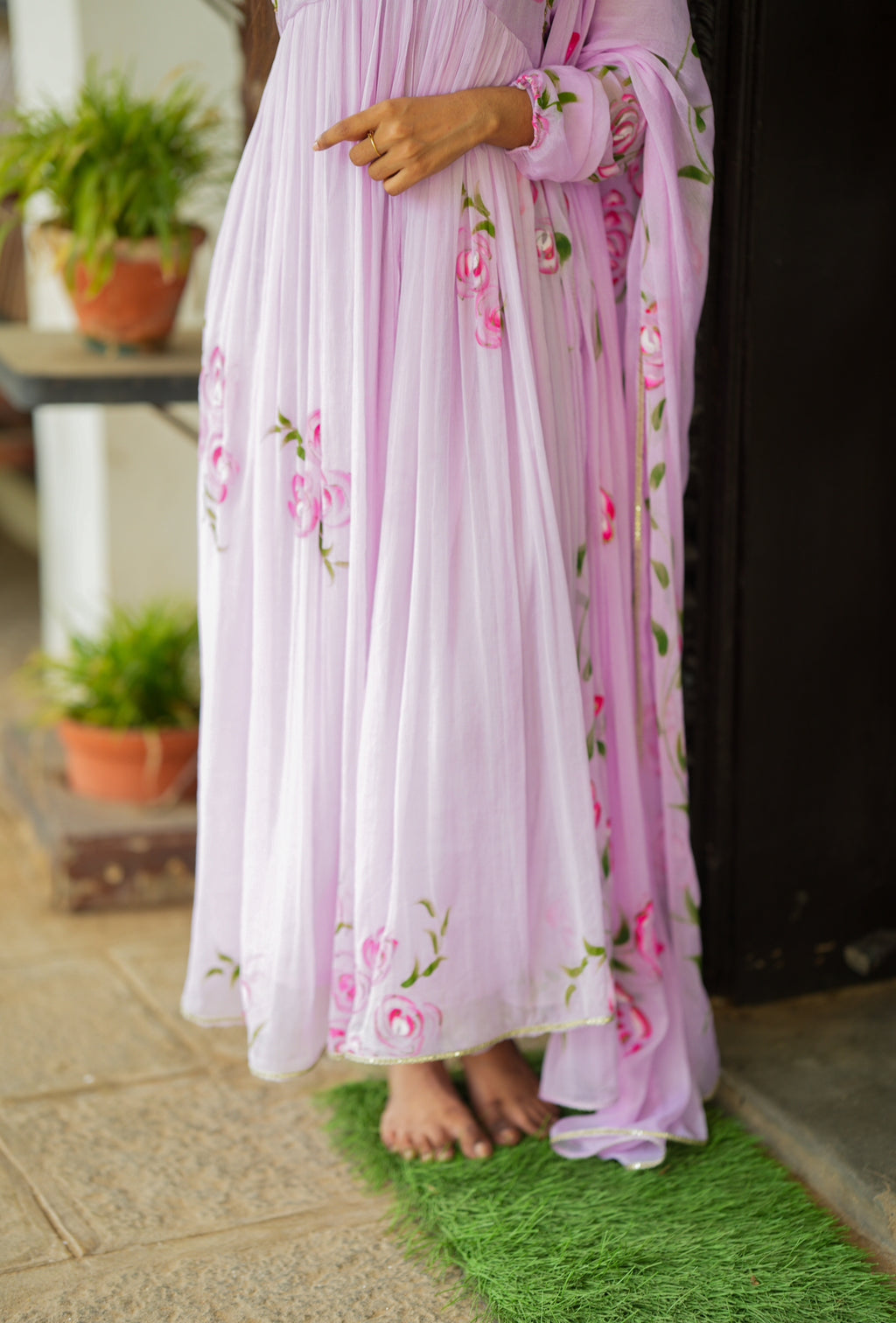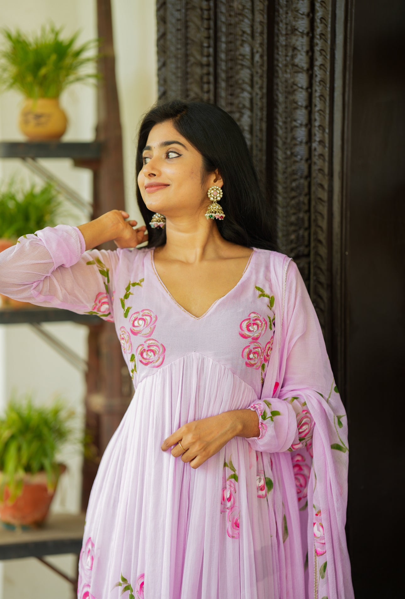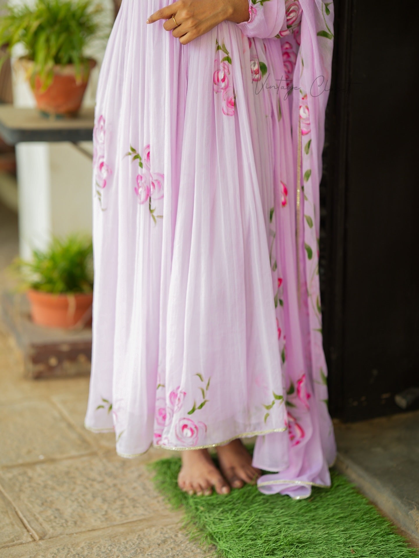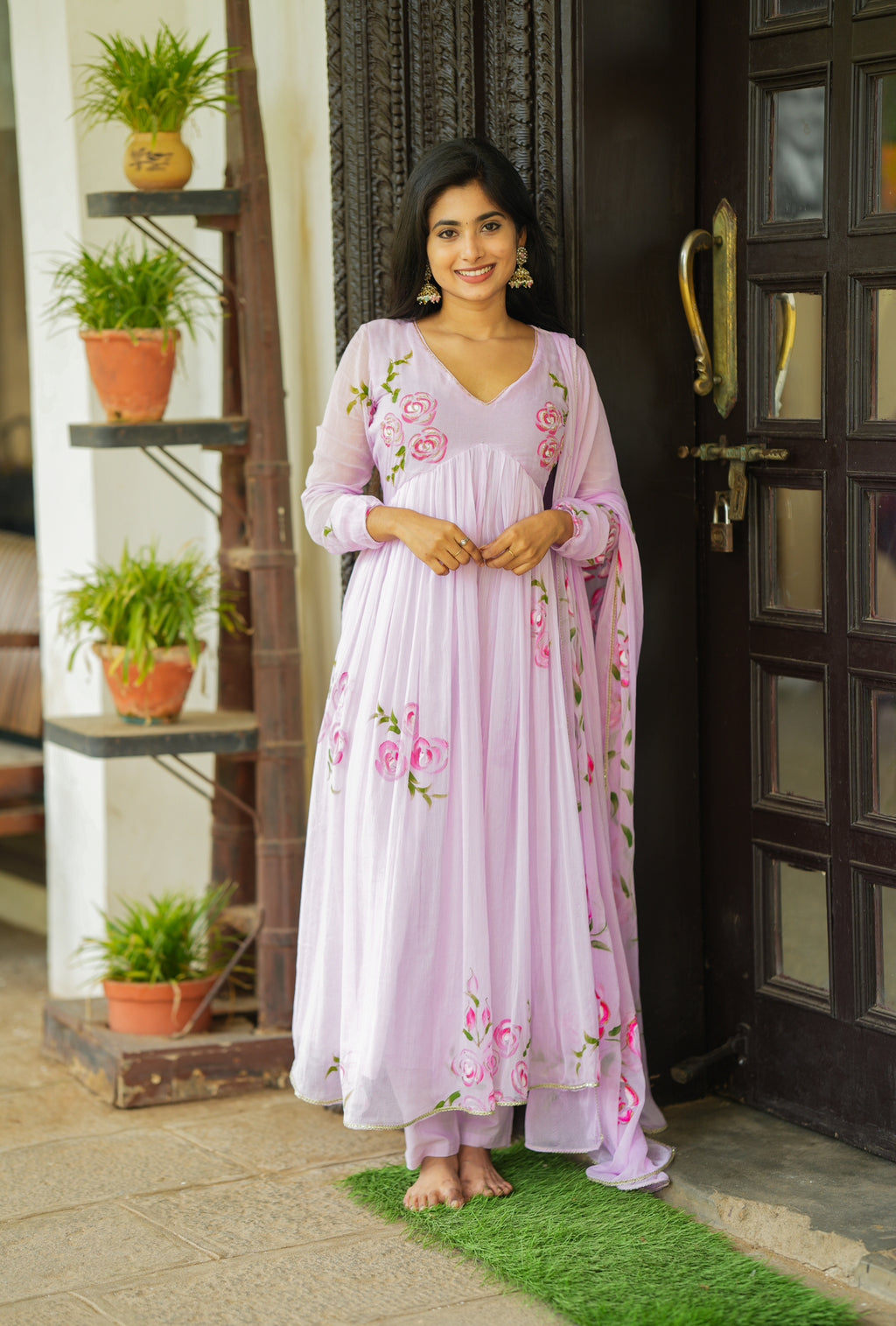 Pure chiffon with alia cut and tiny pleats for flare comes with full sleeves and hand paint over the Kurti and dupatta