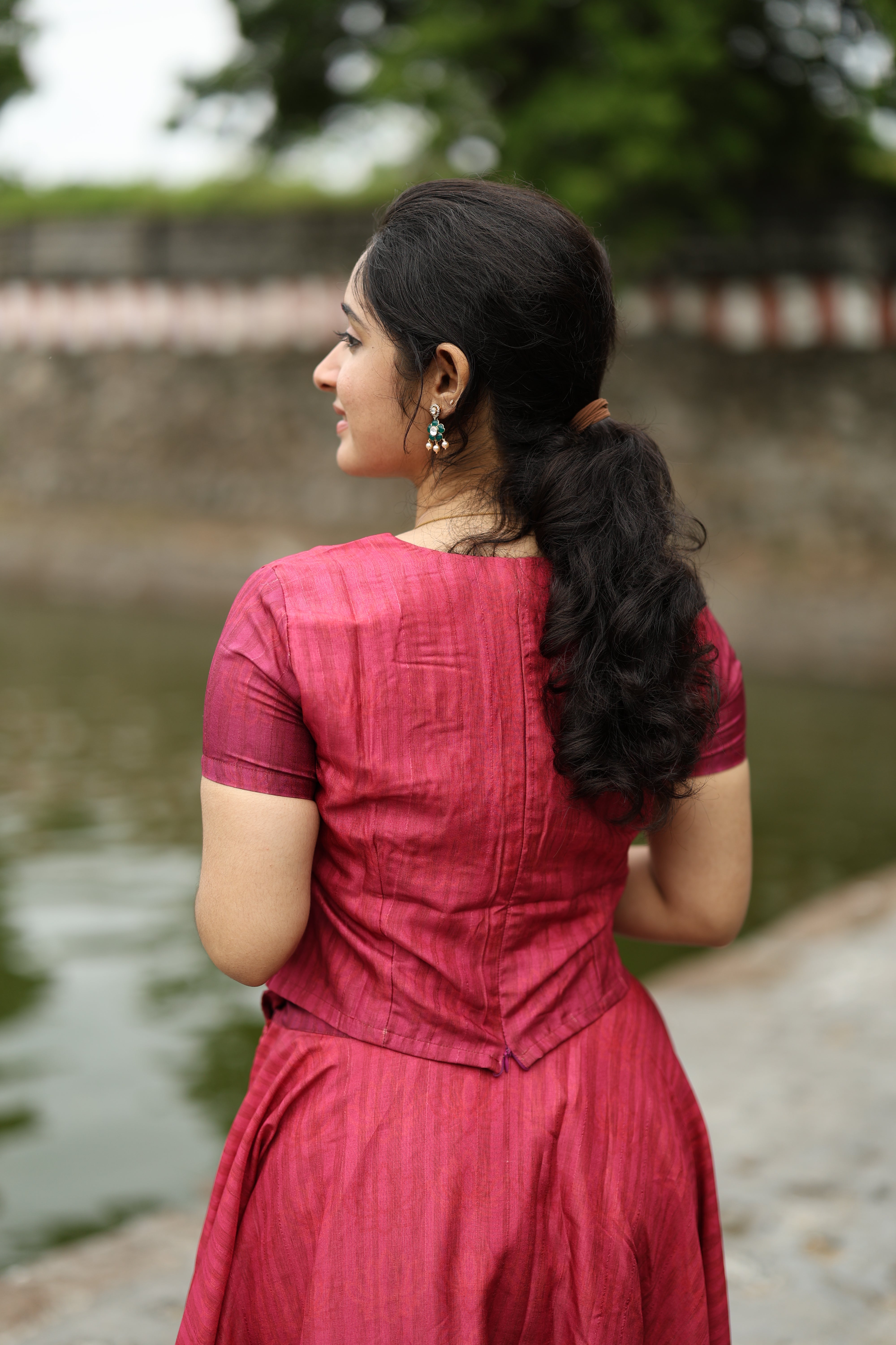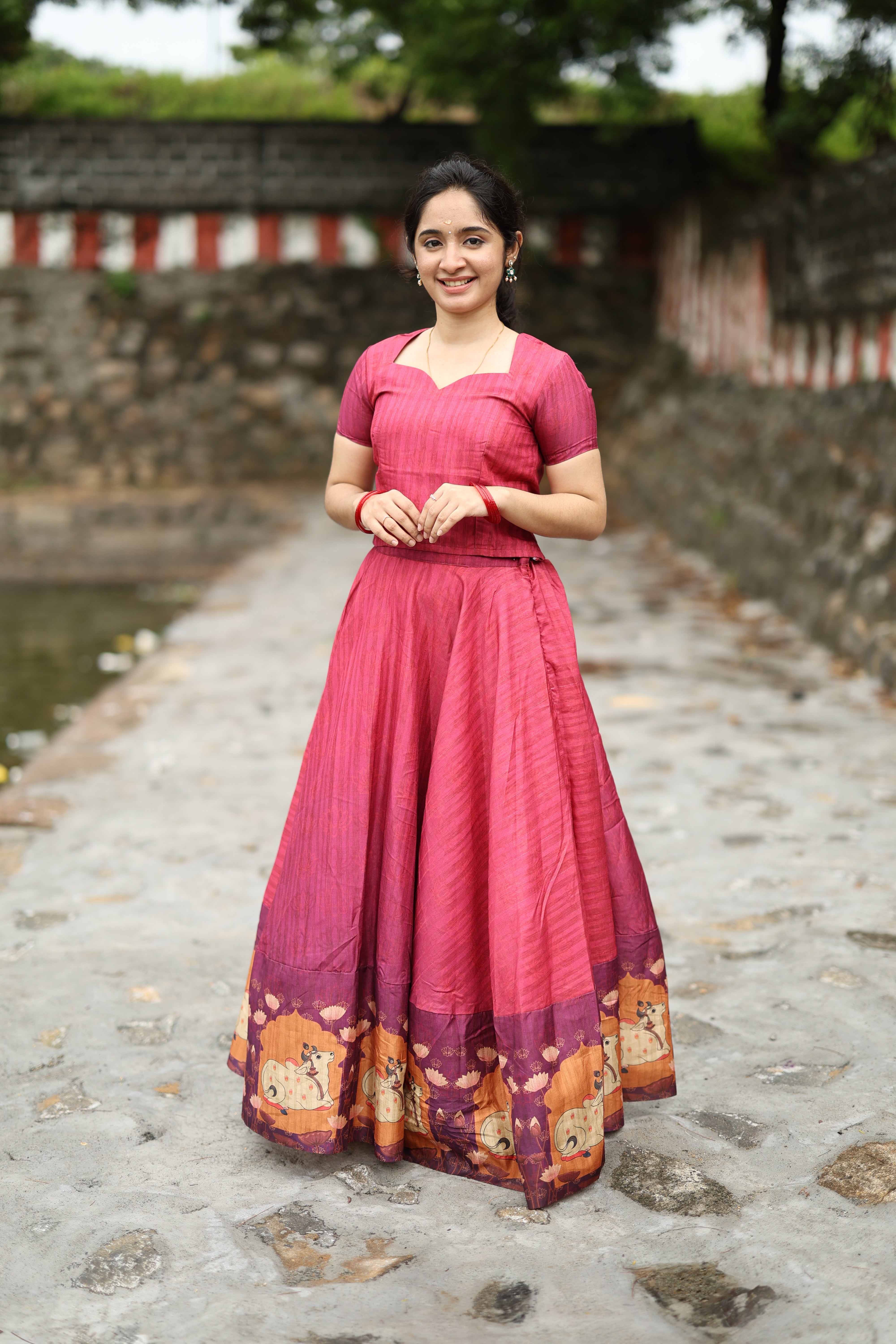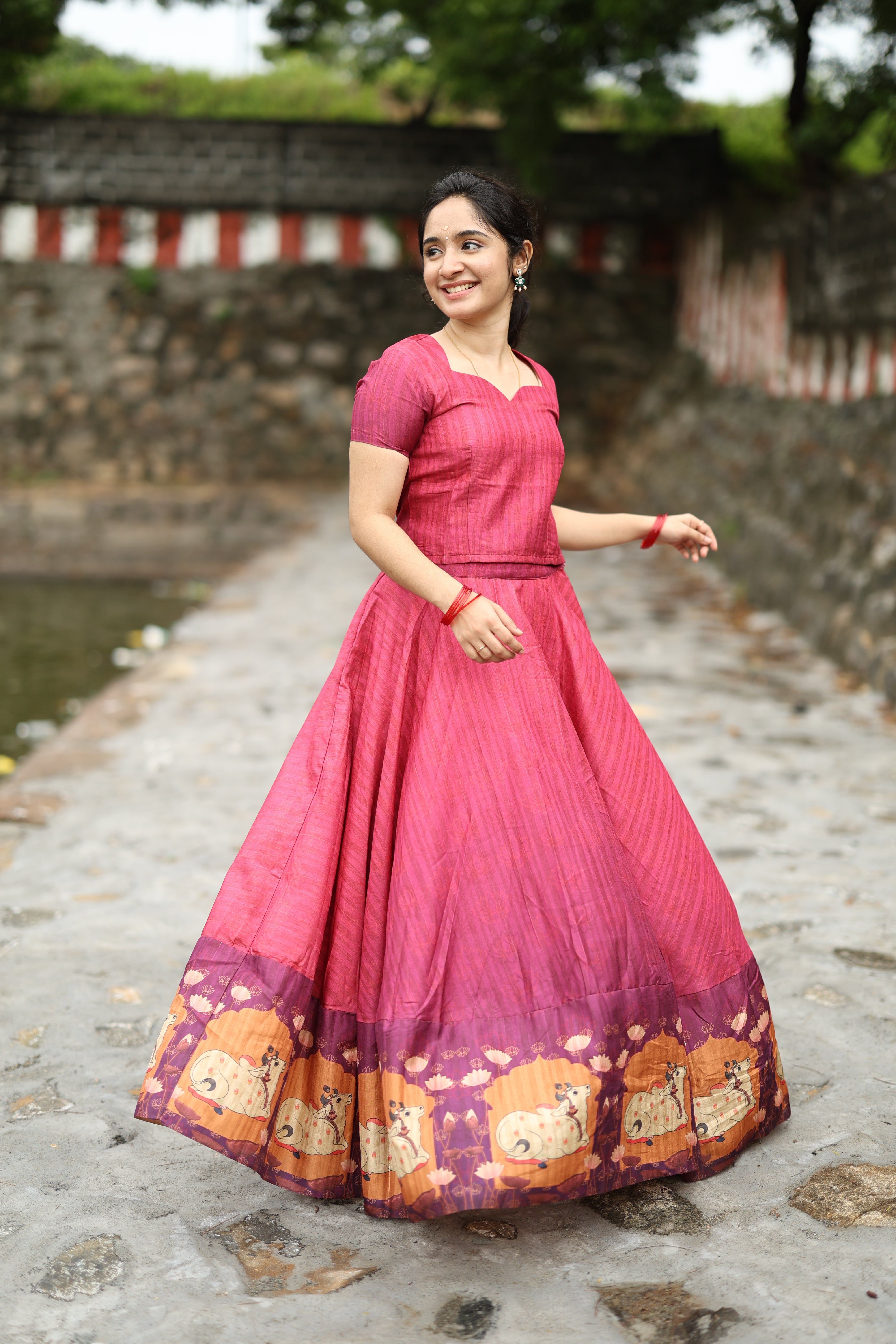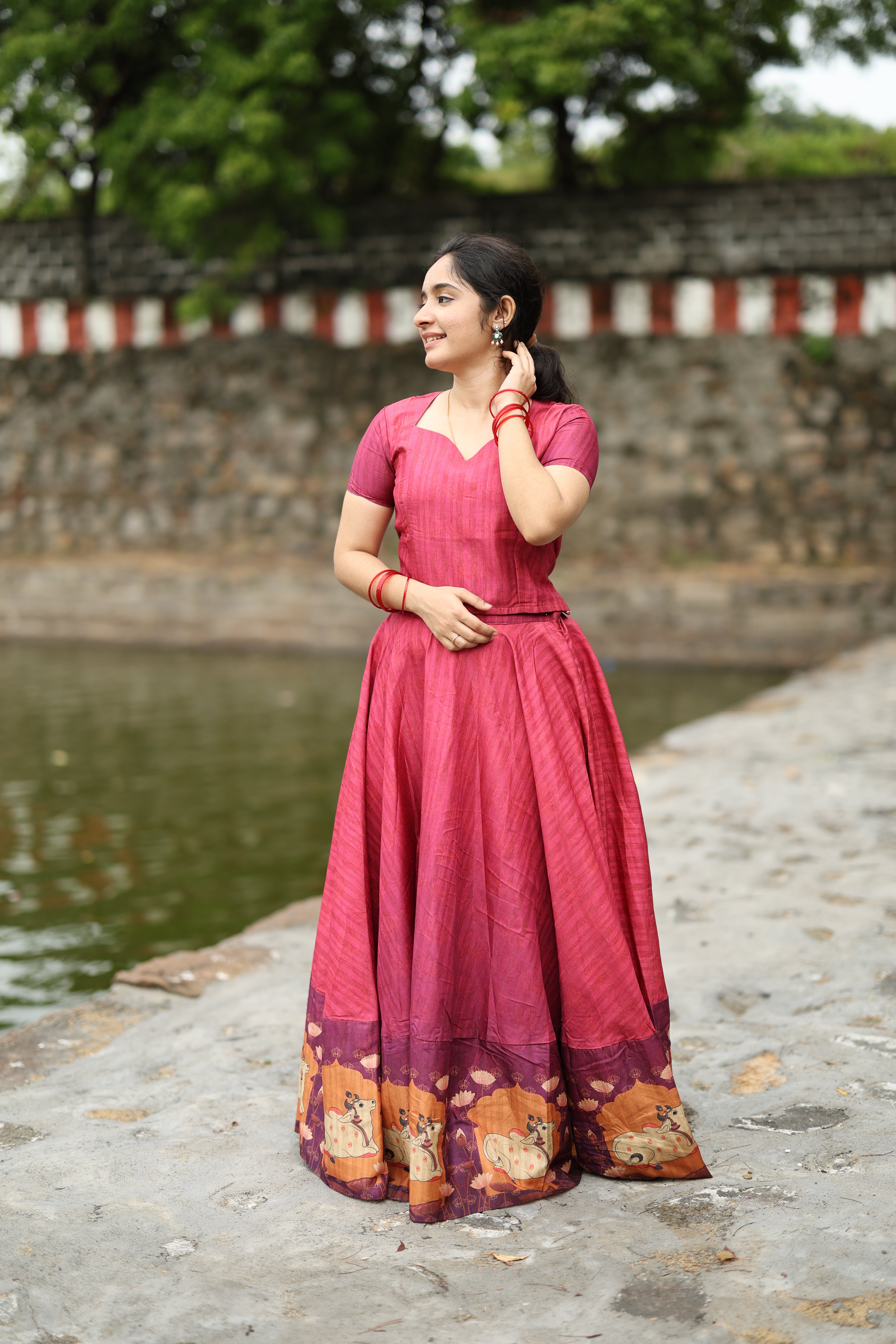 Semi tussar silk featuring a short sleeve and V neck top with a flowing full circle skirt.