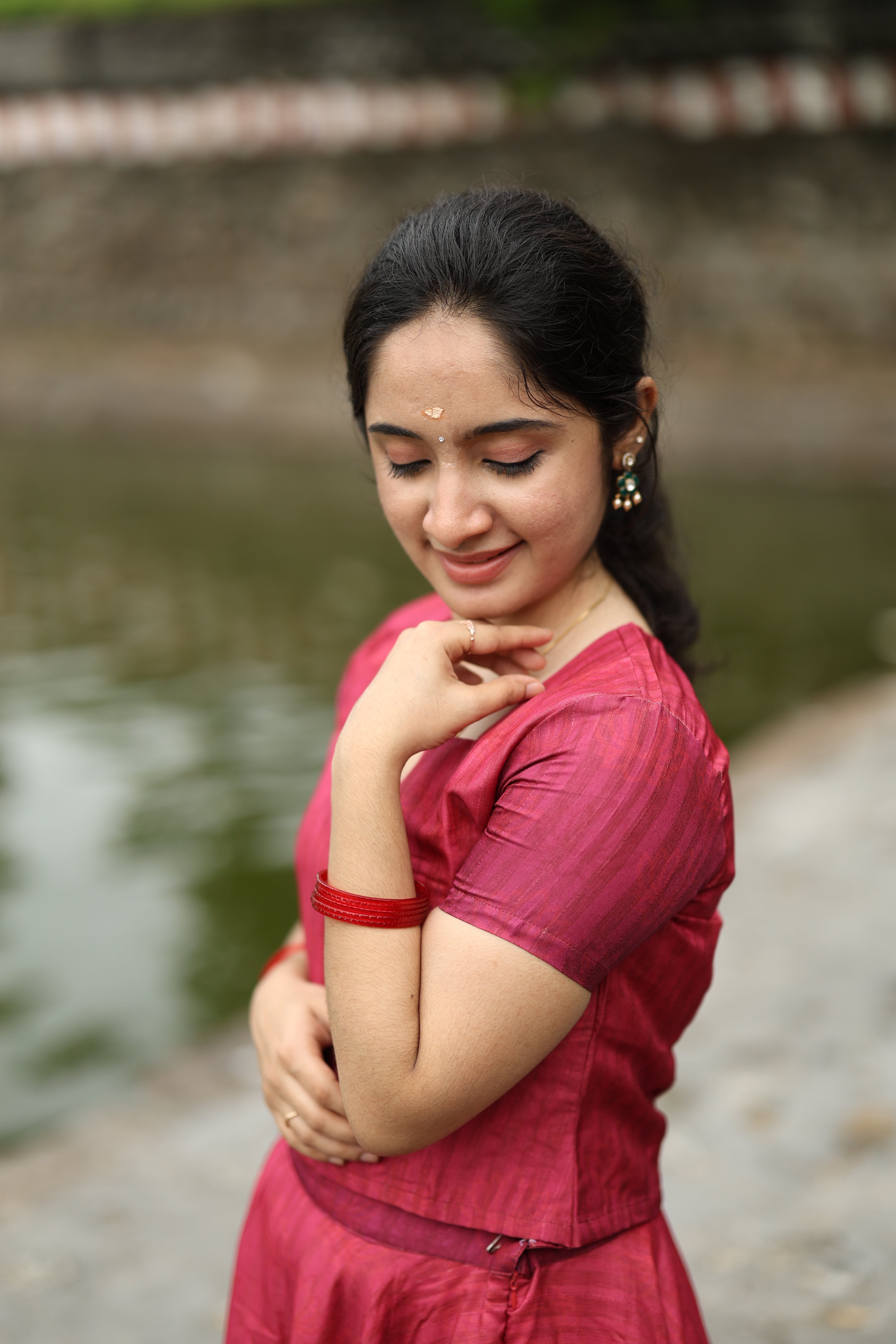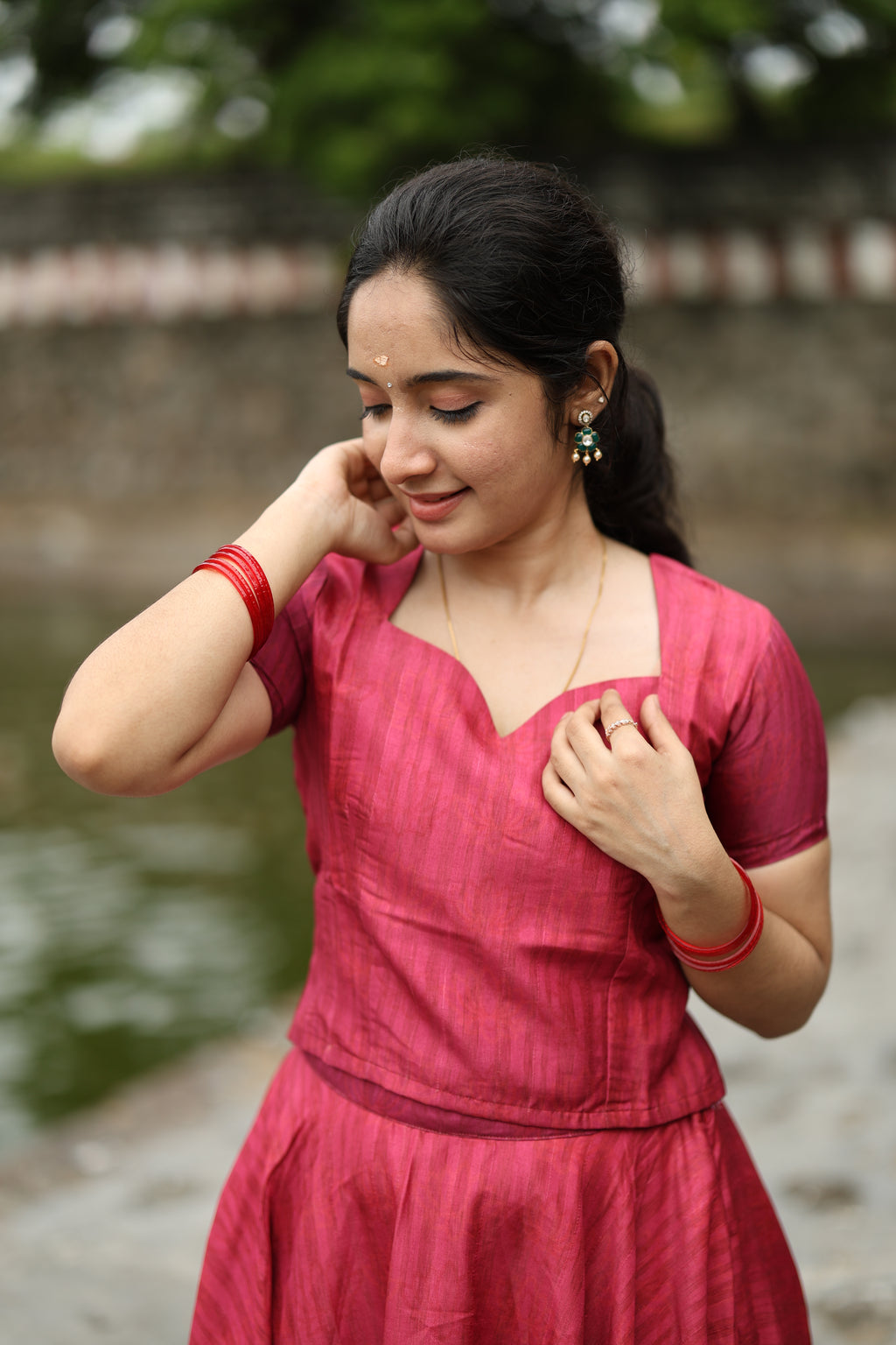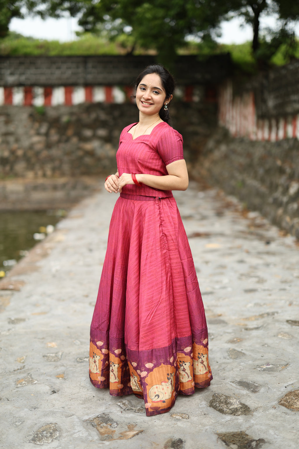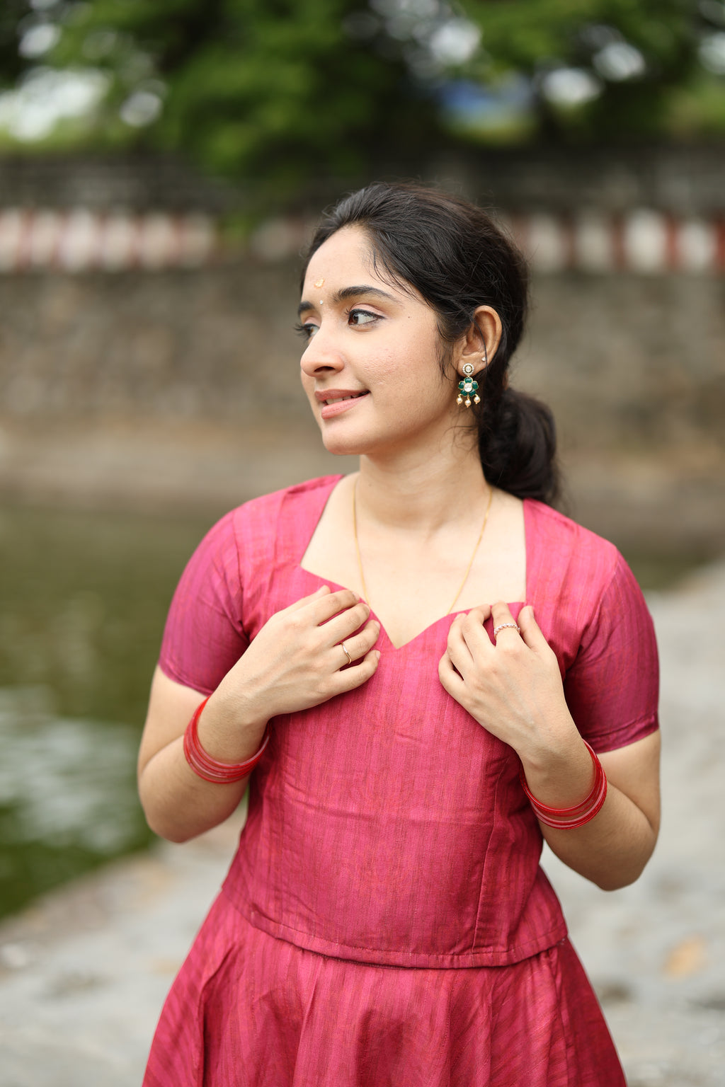 Semi tussar silk featuring a short sleeve and V neck top with a flowing full circle skirt.