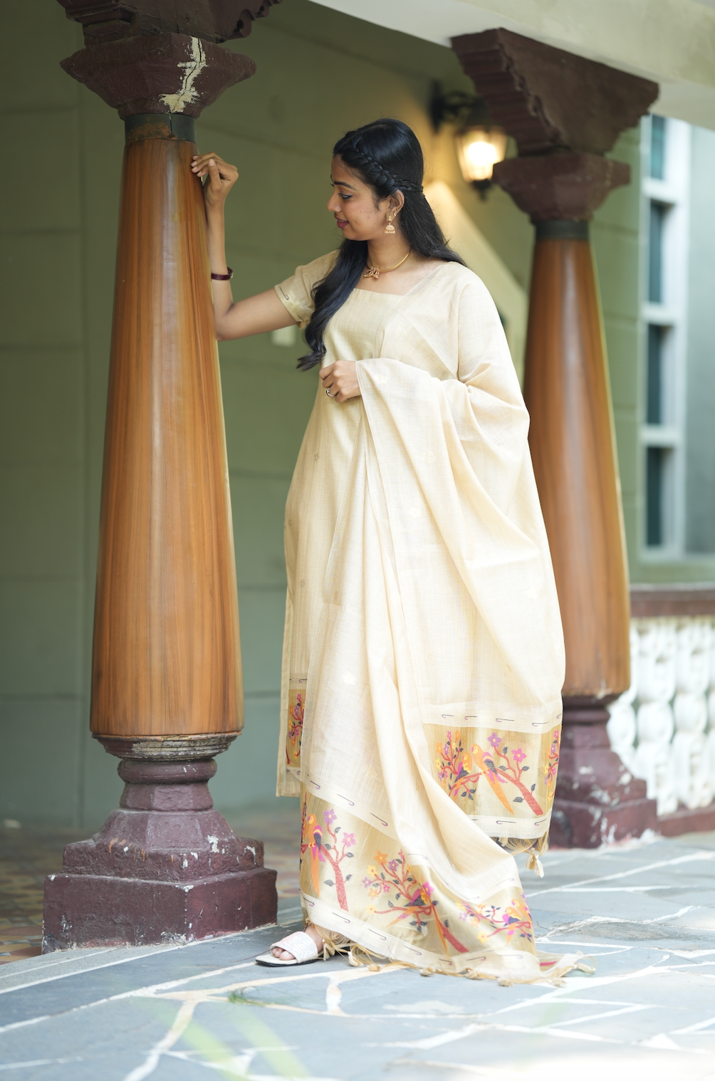 The monotone ivory shade and woven floral and parrot pattern with small butta add a touch of sophistication.