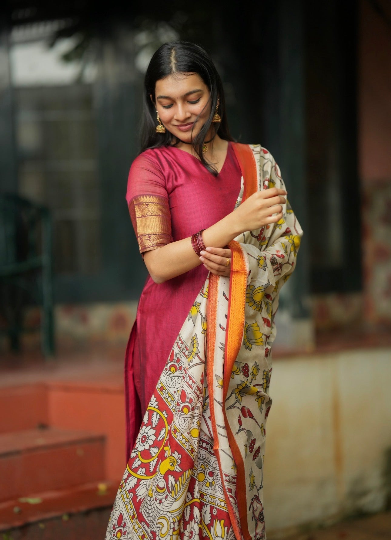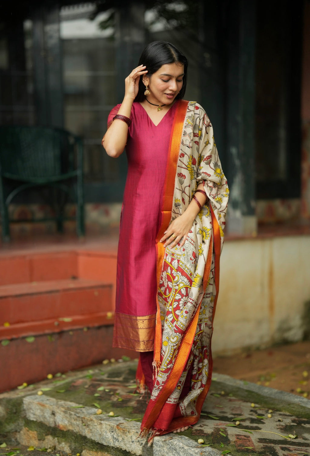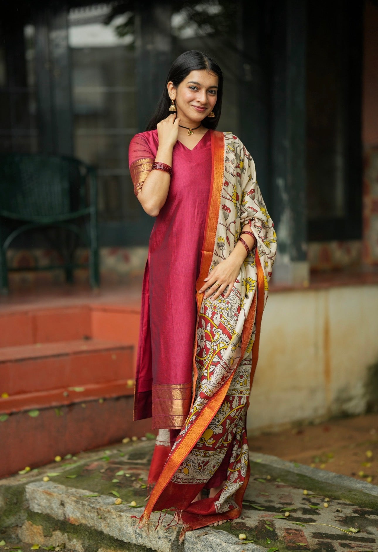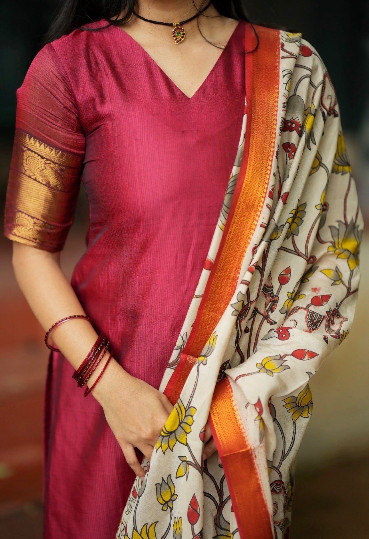 Paired with a raw silk bottom and full size pen kalamkari complementing dupatta with full tassels over