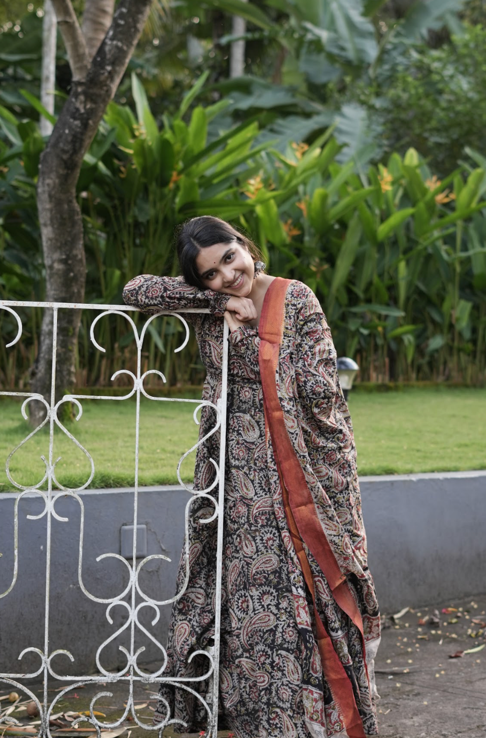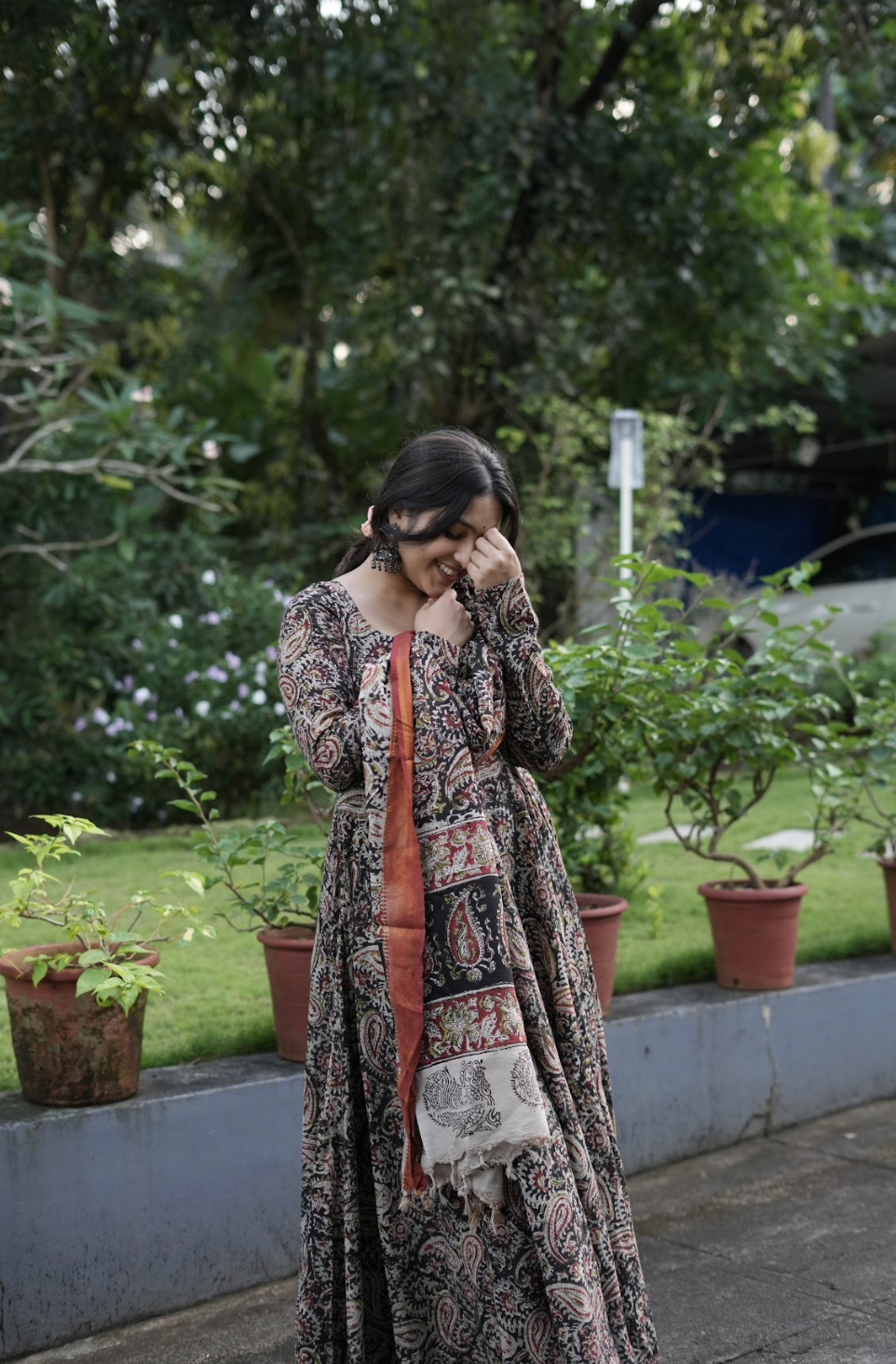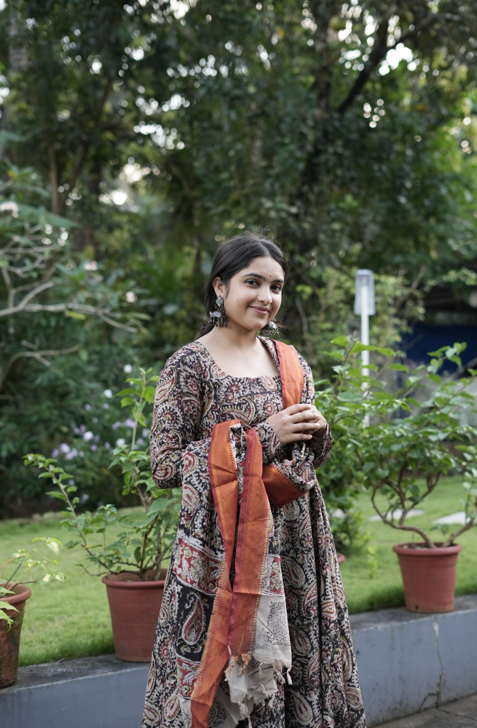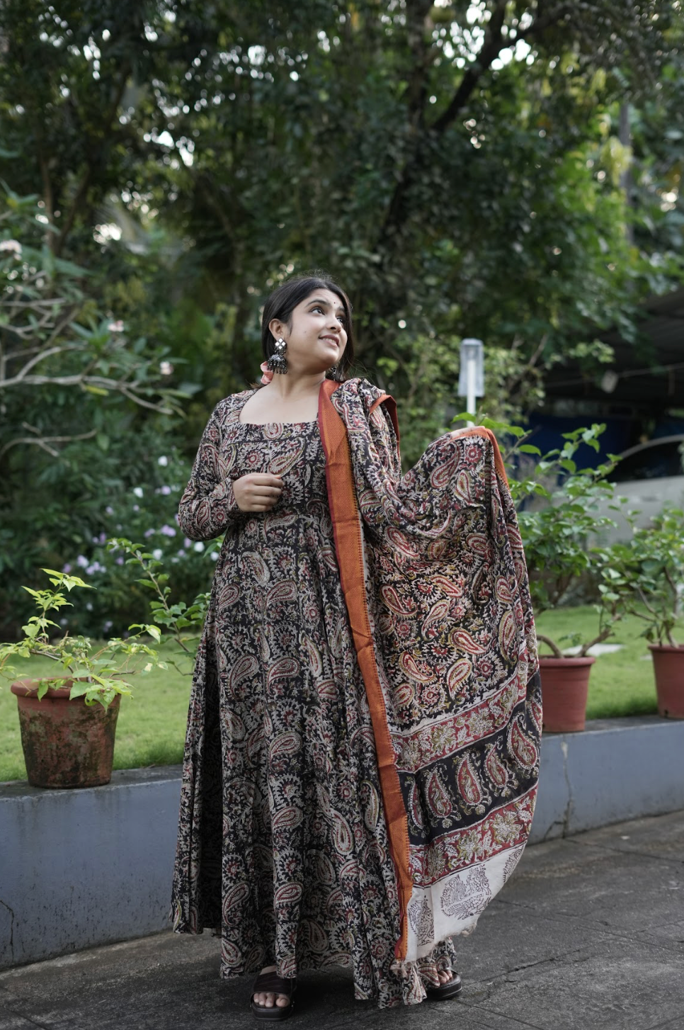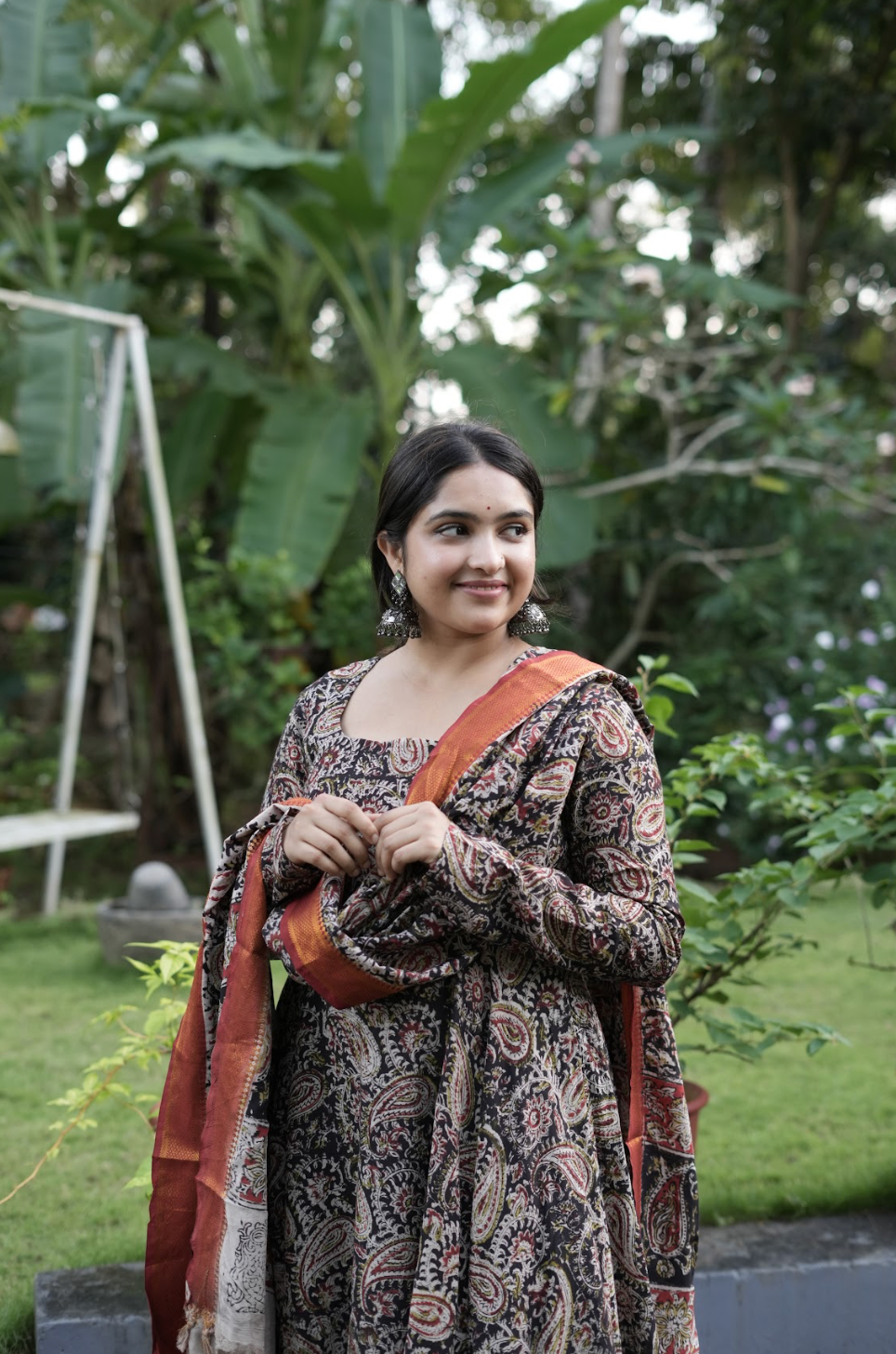 Authentic kalmkari Anarkali suit with Kalamkari dupatta with nizam borders